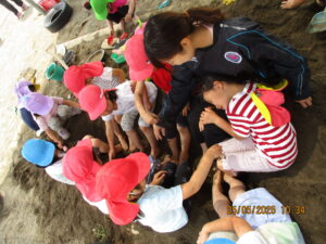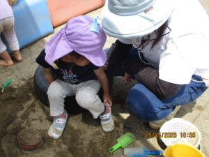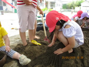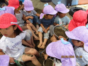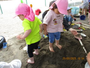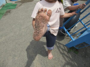 どろんこ遊びが始まる前に砂の感触に慣れるように