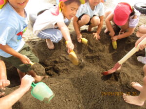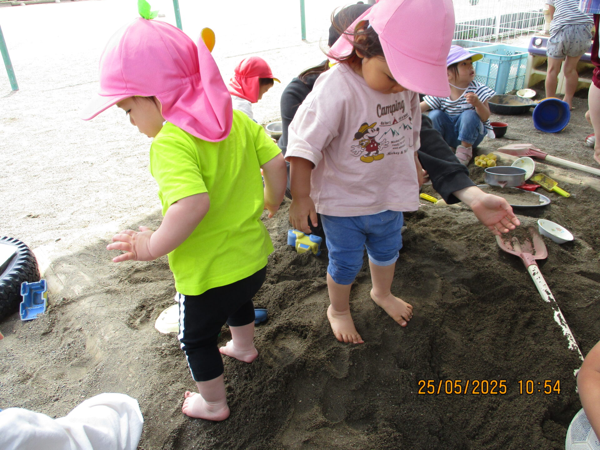 砂場の砂が一番冷たくて気持ちいいことに気がつき始めた子どもたち