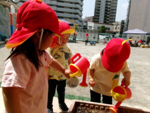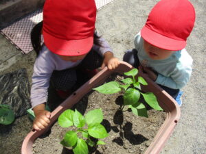園庭では、先日植えたピーマンといんげんに興味を持ち、観察したり、水やりをしたりしています。