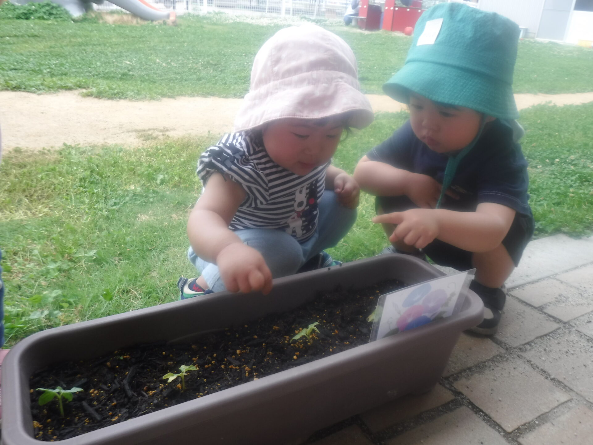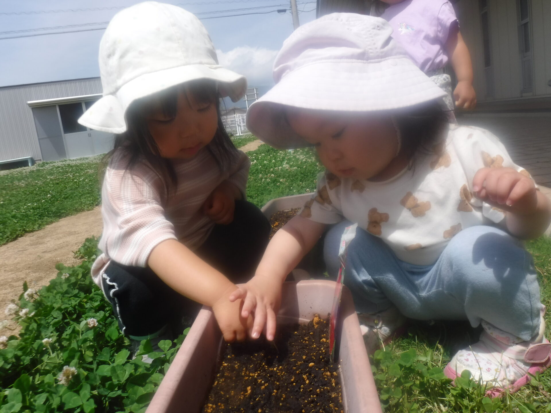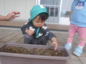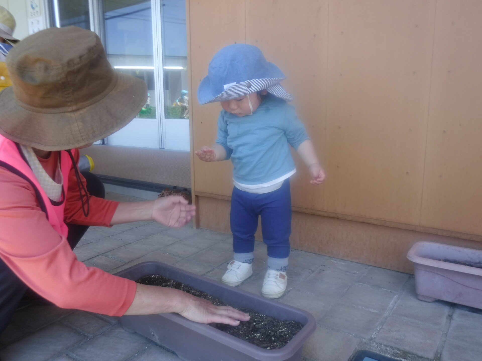 2歳児の真似をしていた遊びの姿から、あさがおの種を用意して渡すと、早速プランターに落としてみたり、土をかぶせてみたりして楽しむ姿がみられました。