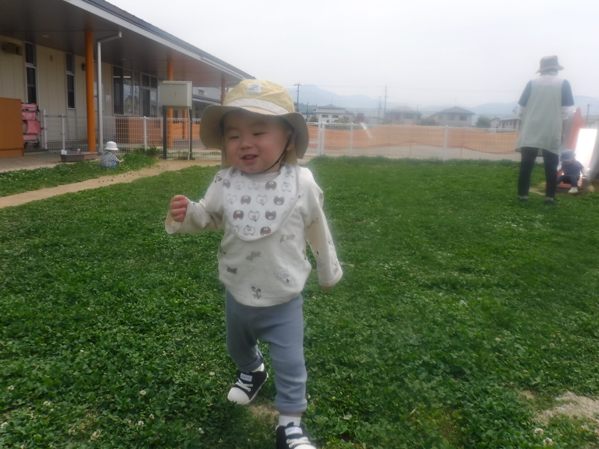 園生活にも少しずつ慣れてきた子どもたち。大好きな砂場遊びだけでなく、戸外を探索し、園庭のクローバーの中を走ったり、花を摘んで楽しく遊ぶ姿が増えてきました。