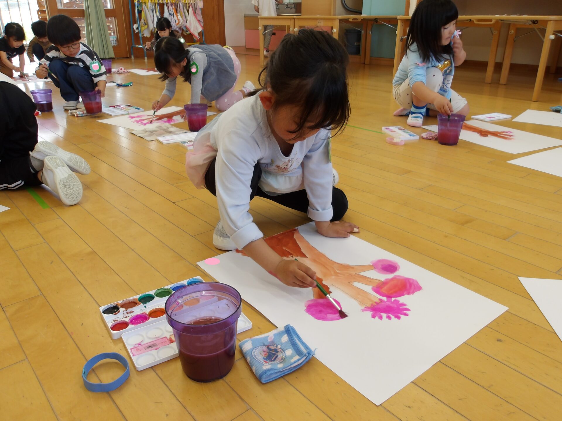 年長になって始めた固形絵の具。桜の絵を描く活動では、”桜のピンクを作ってみたい”の気持ちも合わさり、友達同士で色の作り方を教え合いながら色の発見を楽しむ姿が印象的でした。