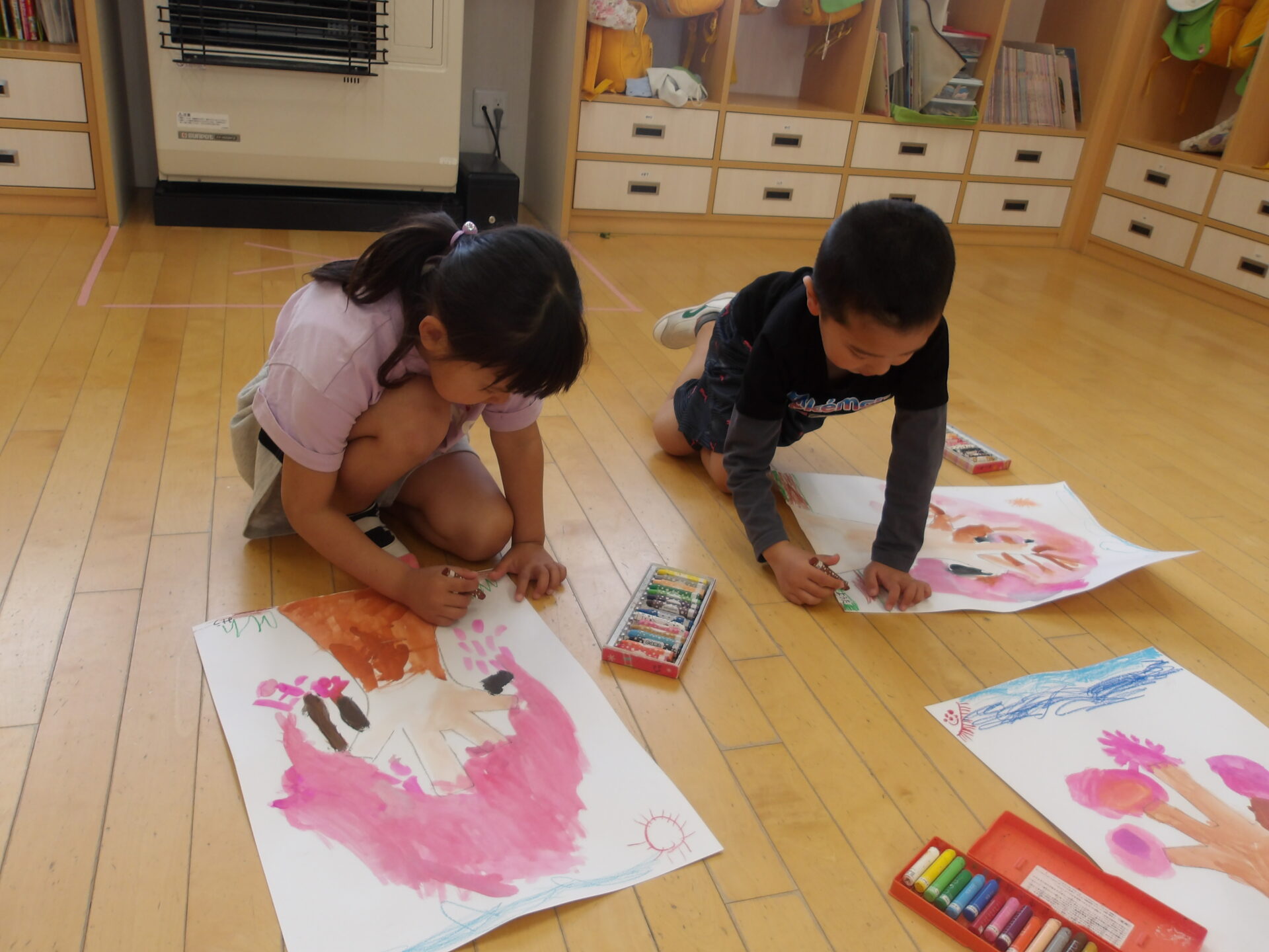 桜の色を思い出し、保育士や友達に伝えながら楽しんだお絵描きの時間になりました。
