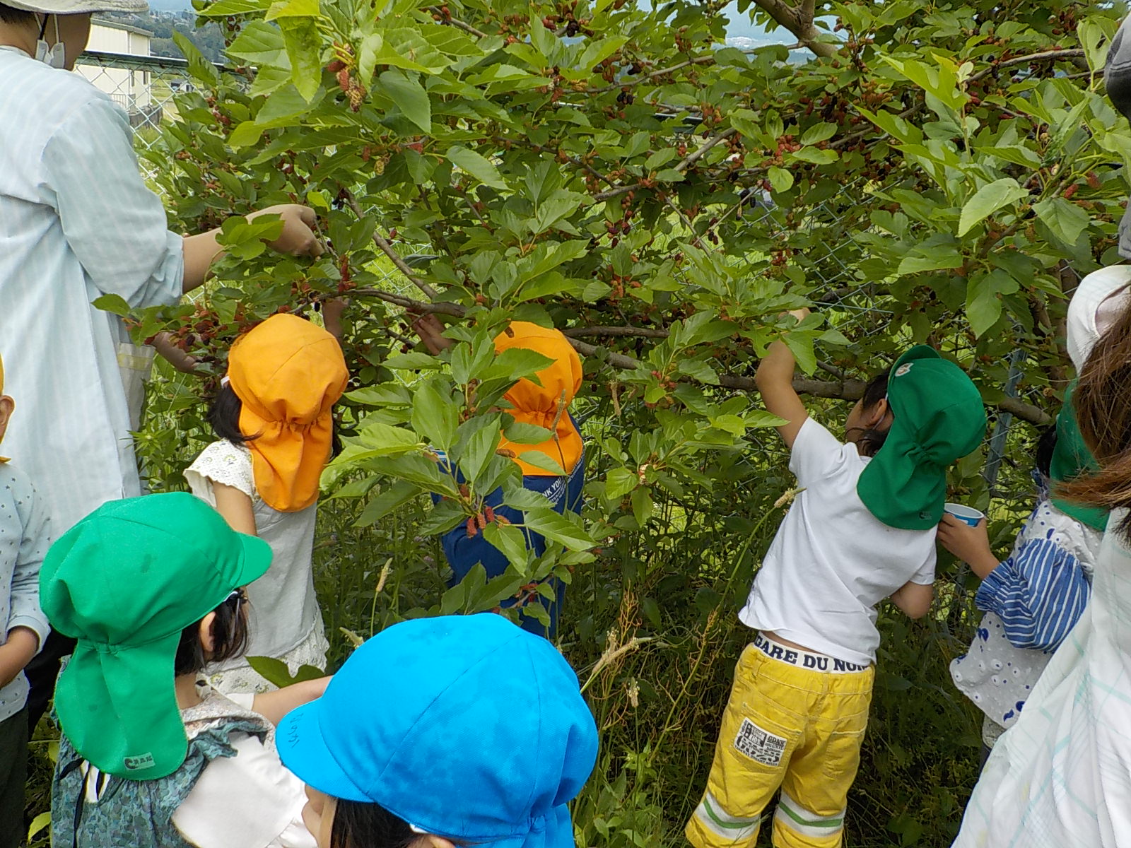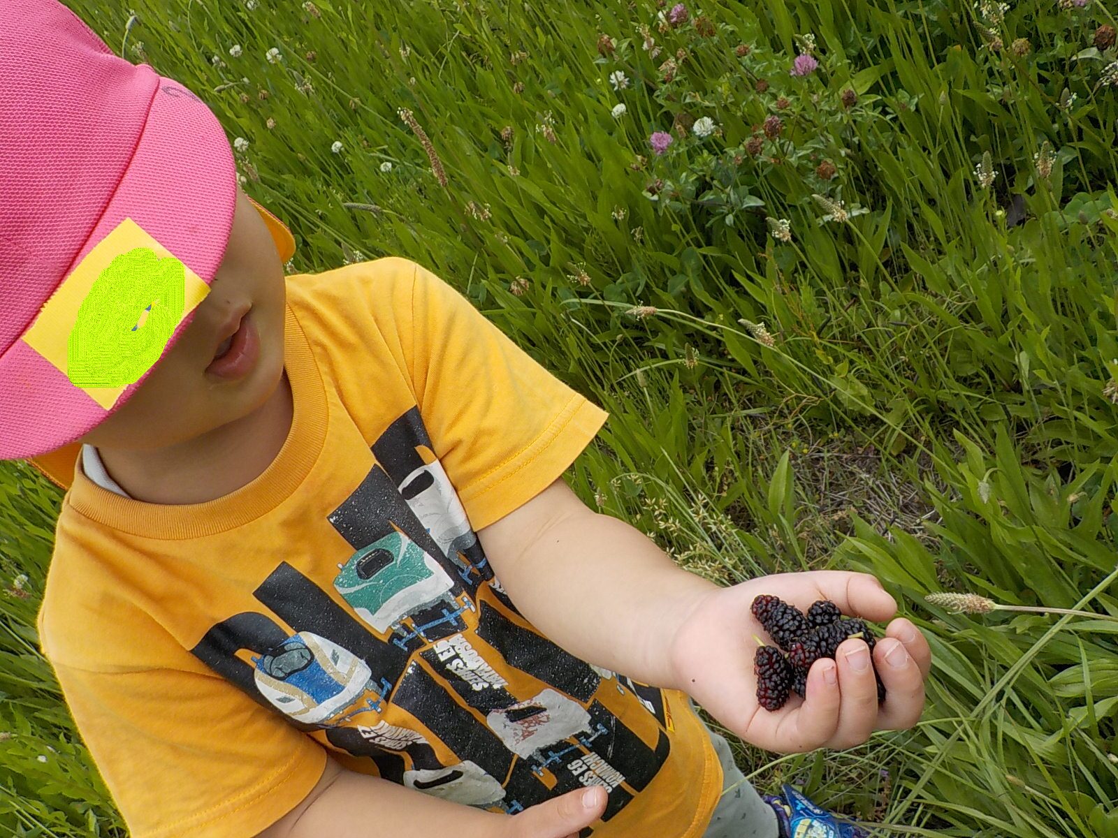 ・この数日後、土曜参観日で来てくれたお家の方とも一緒に桑の実採りをしたり、「ねぇ食べてみて」と味わったりする姿があり、お家の方も「こんな経験ができていいね」と子どもの気持ちを受け止め、共感してくれていたのも素敵な場面でした。