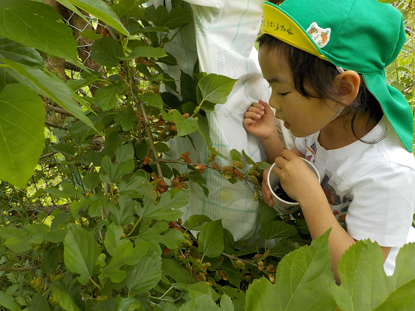 ・毎年この時期になると桑の実を採って食べるのを楽しみにしている子どもたち。誰からともなく食べごろになると気付いて、自然と桑の木に群がっていきます。初めは「これ何?」「いらない」と言っている子も、周りの子が楽しそうに採ったり美味しそうに食べたりする様子を見て、いつの間にか口にしているなんてことも…保育士が伝えなくても子どもたち同士で伝え合い、分け合い、おいしく楽しい経験が共有できることが素敵。