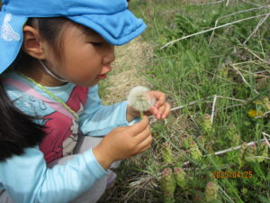 フゥ~と吹いて綿毛が飛んでいく様子が面白いようで、綿毛を見つけてはフゥ~フゥ~としていました。