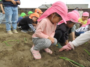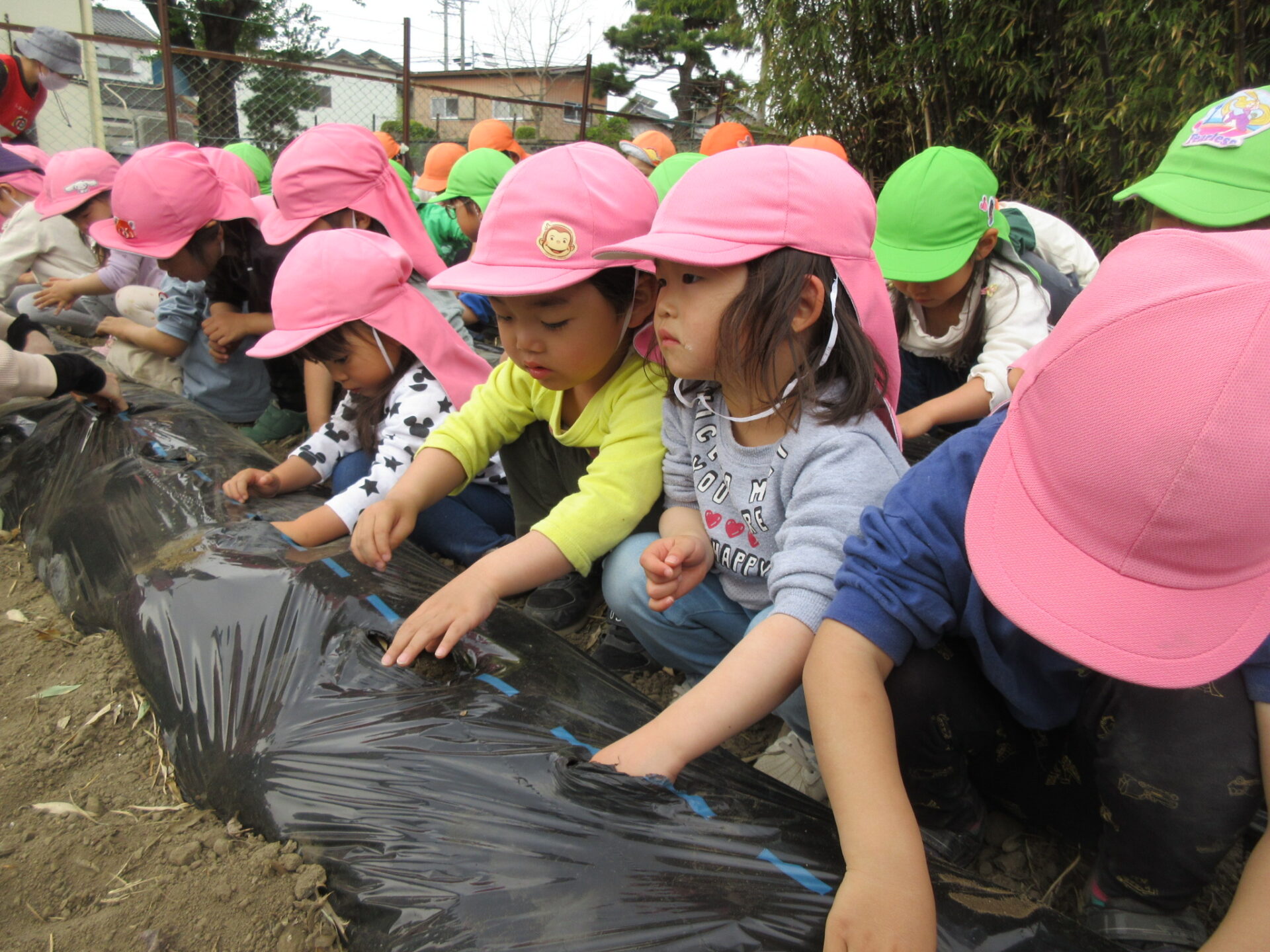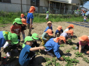 畑にじゃがいも、トマト、スイカ、メロン、ネギ、なす、オクラ、とうもろこし、古代きゅうり等たくさんの野菜を植えました。種を植える際には「お布団をかけてあげるんだよ」「先生水も入れてあげて」と言う子もいました。毎日登園すると畑へ行き、お水をあげたり雑草を抜いたりお世話を頑張っています。