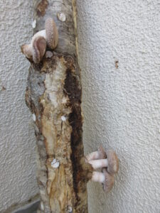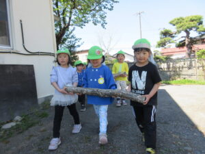 今年は、椎茸栽培にも挑戦しています。しいたけの原木を見た子ども達は「ここにキノコが生えるの?」と驚いていました。