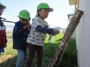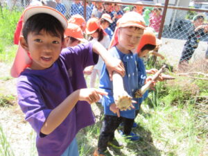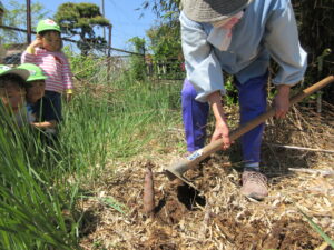 ・土を掘っていると「ありさんがたくさん出てきた」「大きな幼虫がいるよ」と様々な虫を見つけて「畑には虫がいっぱいいるね」と話していました。