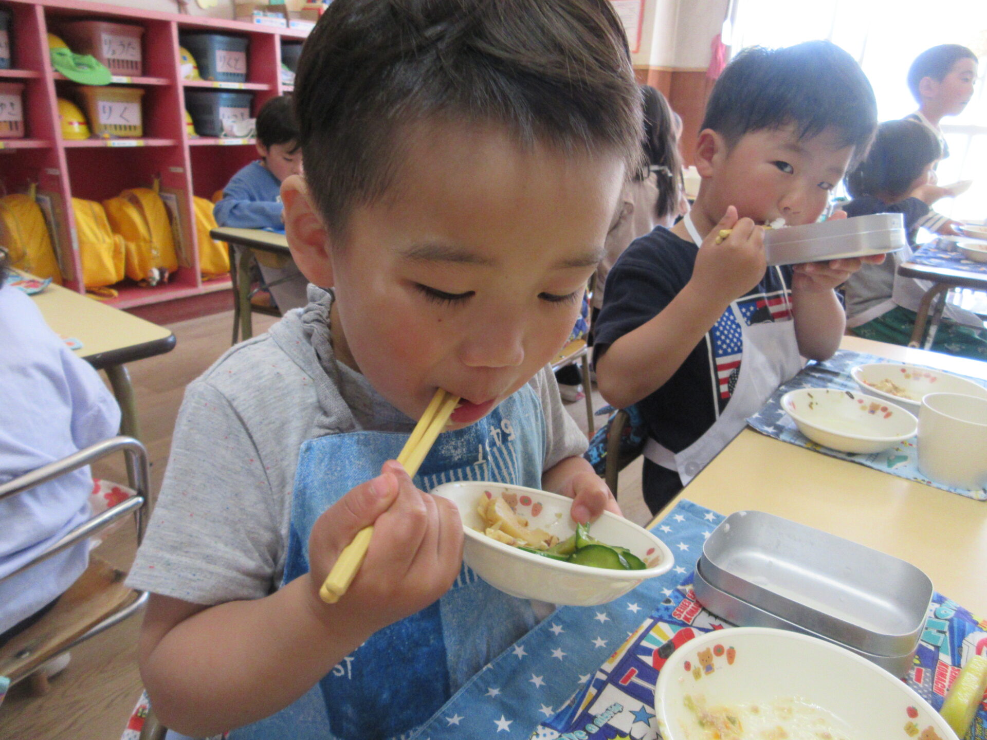 自分たちで収穫したたけのこを料理してもらうと「柔らかくなってる!美味しい!」と大喜びでした!
