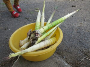 皮を剥いてみると「しろい!ツルツルしてる!」さっきまでのたけのこと違う姿に興味津々でした。
