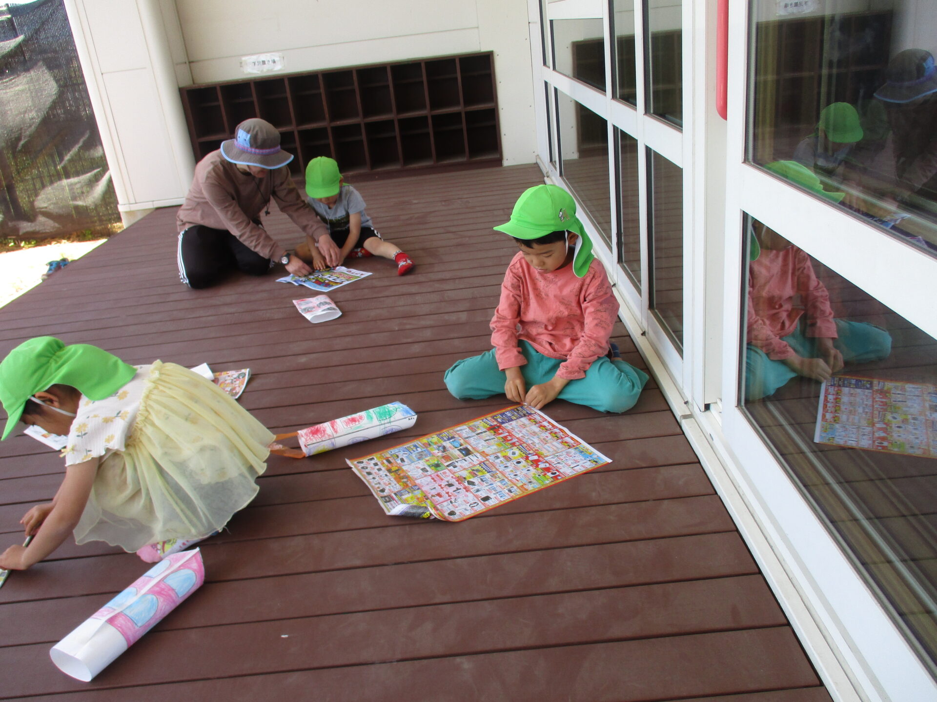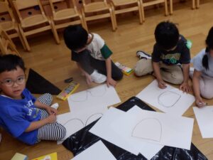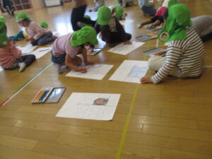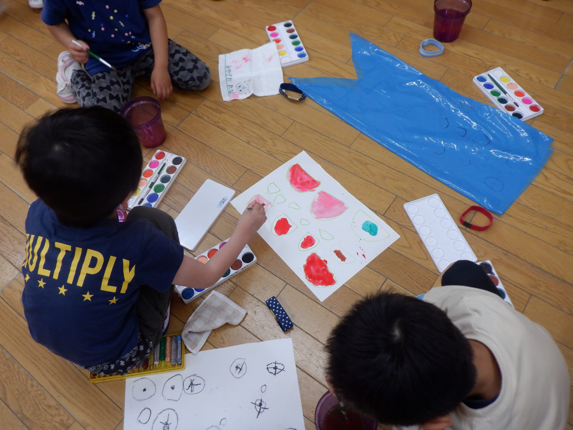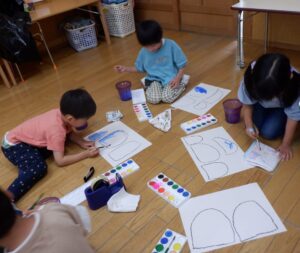 きりんぐみはお父さんこいのぼり、お母さんこいのぼり、赤ちゃんこいのぼり、ふきながしをつくることに。