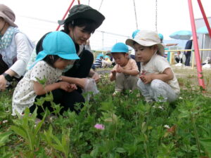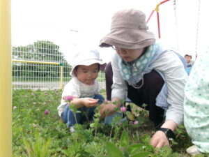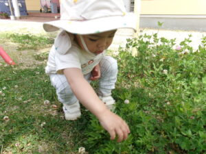 よもぎ以外にもシロツメクサやタンポポ、色んな草花が生えているから、「これ?」と保育士に聞いたり見せたりしています。