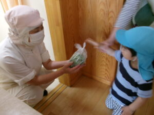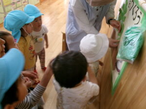 また団子づくりは3歳以上児クラスが行うクッキングですが、作っているの様子を見せてもらったり、給食室の先生によもぎを手渡したりするなど、0,1歳児クラスなりによもぎ団子づくりの雰囲気を感じたり、食や遊びにつながってほしいと思い今回のよもぎ摘みを行いました。