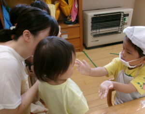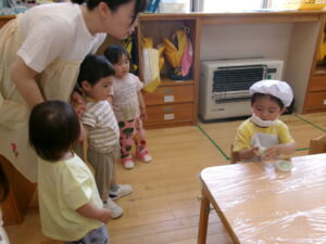 後日、3歳以上児クラスのよもぎ団子づくりを見に行きました。