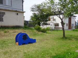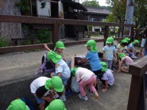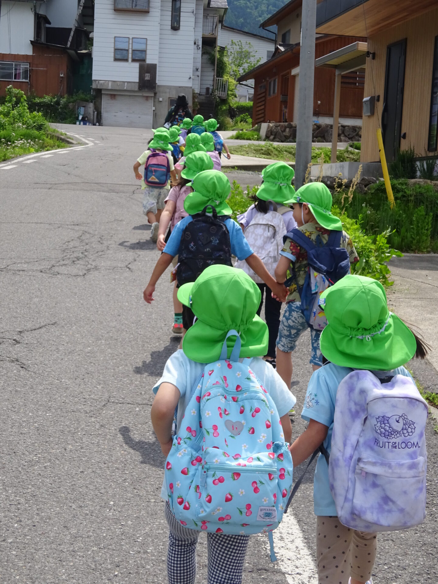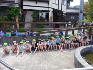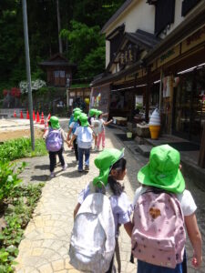 帰る時間が近づき、お着替えタイム。全く濡れずに済んだ子や逆に全部の着替えが必要な子もいましたが、それぞれに帰る支度を整えました。途中でお客さんが二人来ていていたので「お騒がせしました。ごゆっくり~。バイバ~イ✋」と伝え、足湯に「ありがとうございました」とお礼を言って帰路へ・・・。お店の前を歩いている時にソフトクリームの置物が見えると「あぁ、食べたいよぉ」と言い、文字が読める子は何味が売っているかもわかるので「〇〇味がいいな」「〇〇味食べたい」「僕も・・・」と盛り上がり、そのうち「先生、お金持ってきた?」と聞かれてしまいました😅歩き進めて麻釜まで来るとちょうど野菜を茹でに来た人がいたので「何しているの?」「何のお野菜?」と声を掛け、村の方とふれあうことができました。