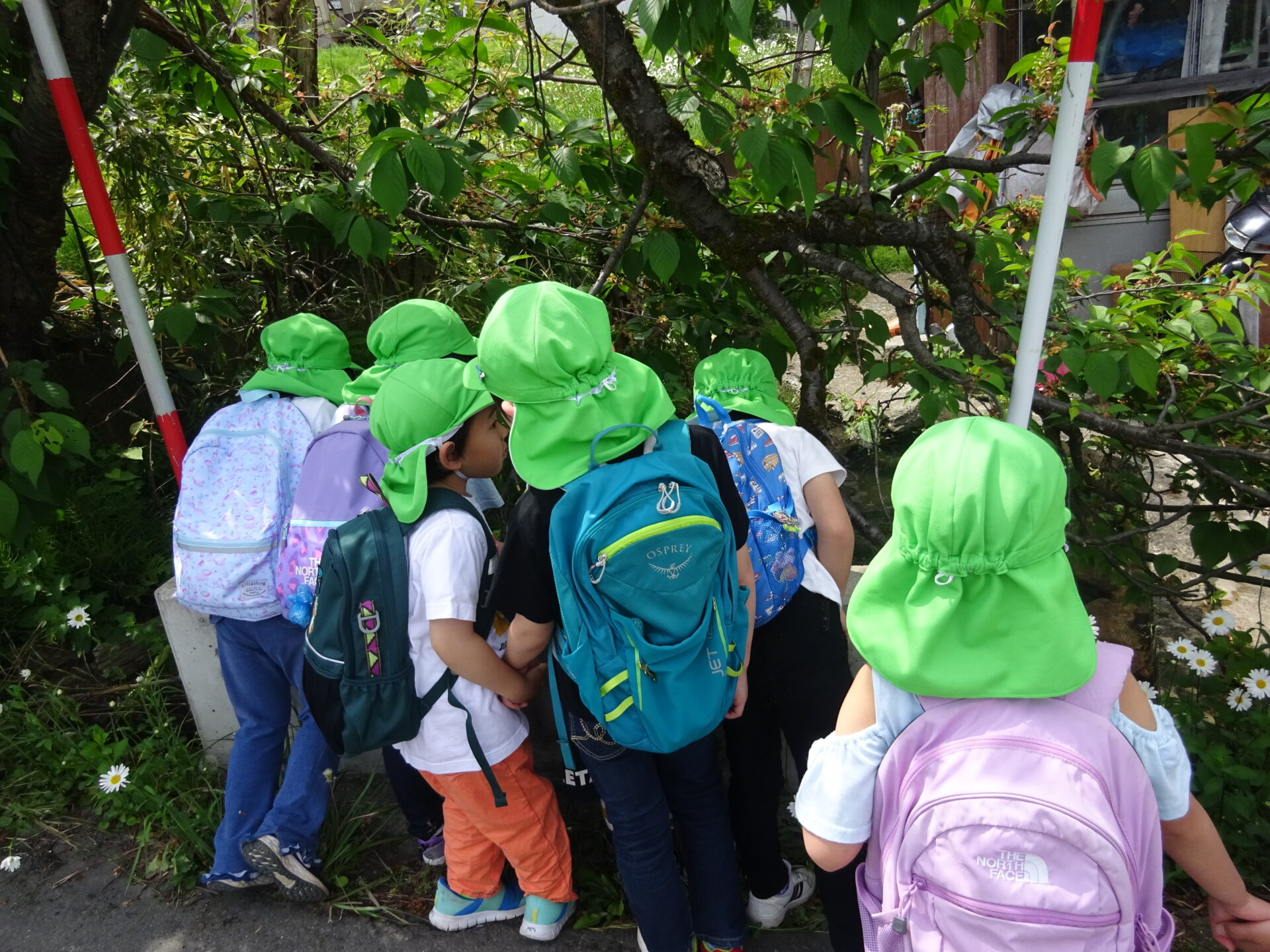 〇歩き慣れている道を通ったが、だからこそちょっとした変化に気づき、咲いていた八重桜が散っている木を見つけて「この間、咲いていたのに」と言う子、落ちていた桜の実を見つけて「あっ、サクランボだ」と言う子、「あそこにお花が咲いている。何て言うお名前のお花?」と聞いてくる子など、自分が発見したことや感じたことを友だちと共有したり、担任に質問したりすることがあった。