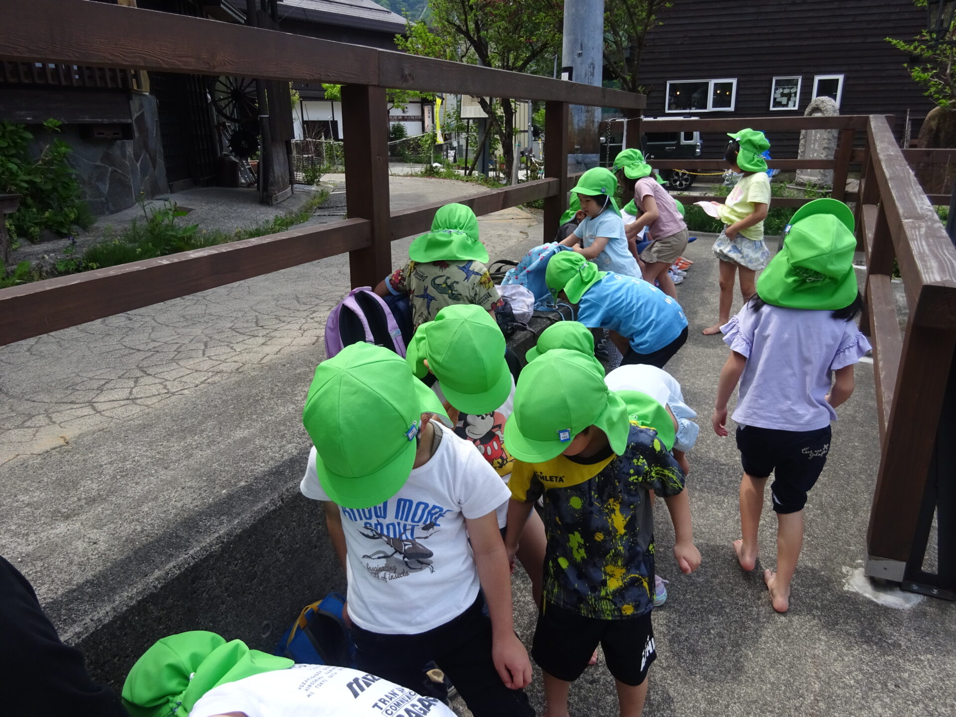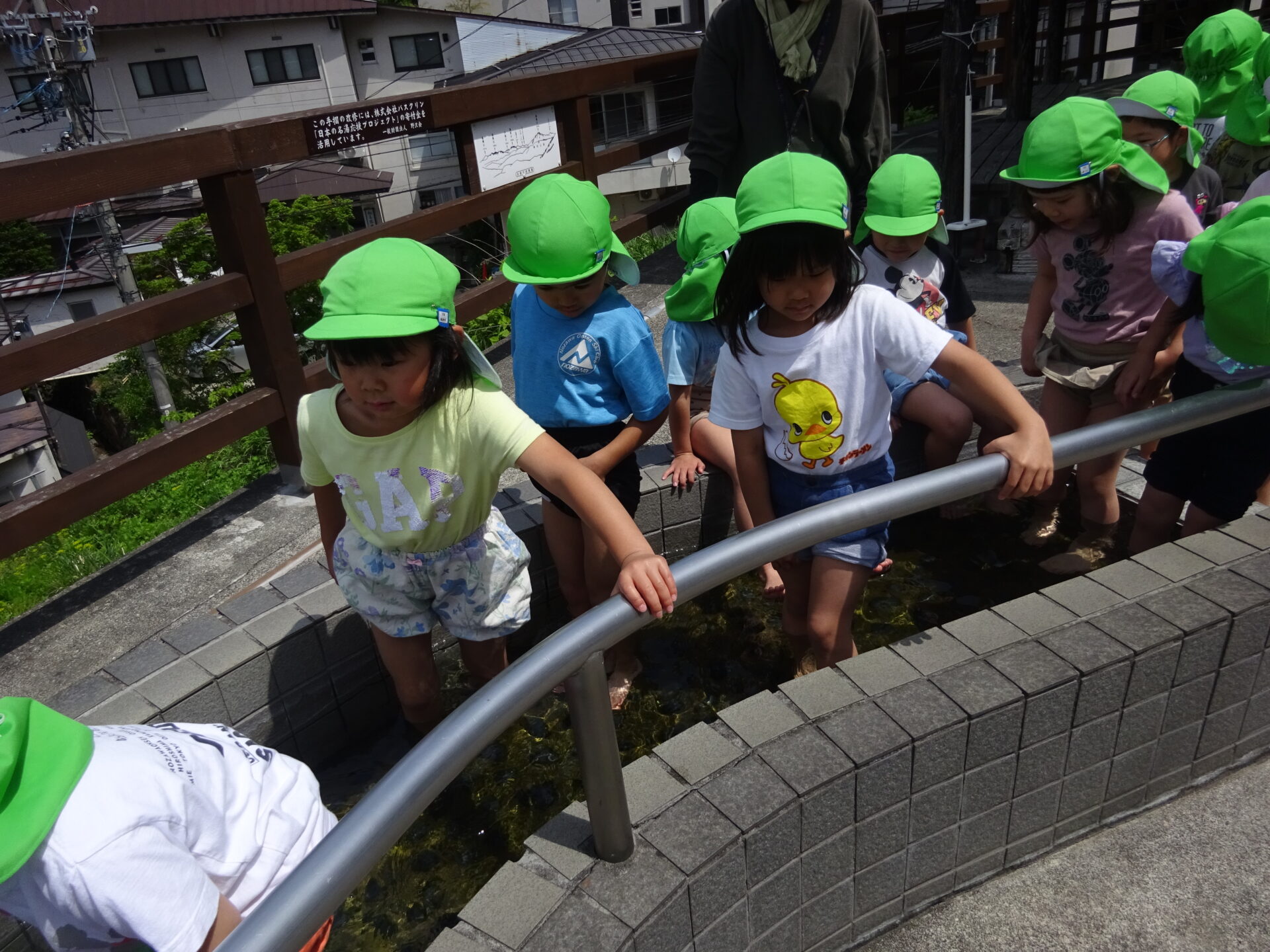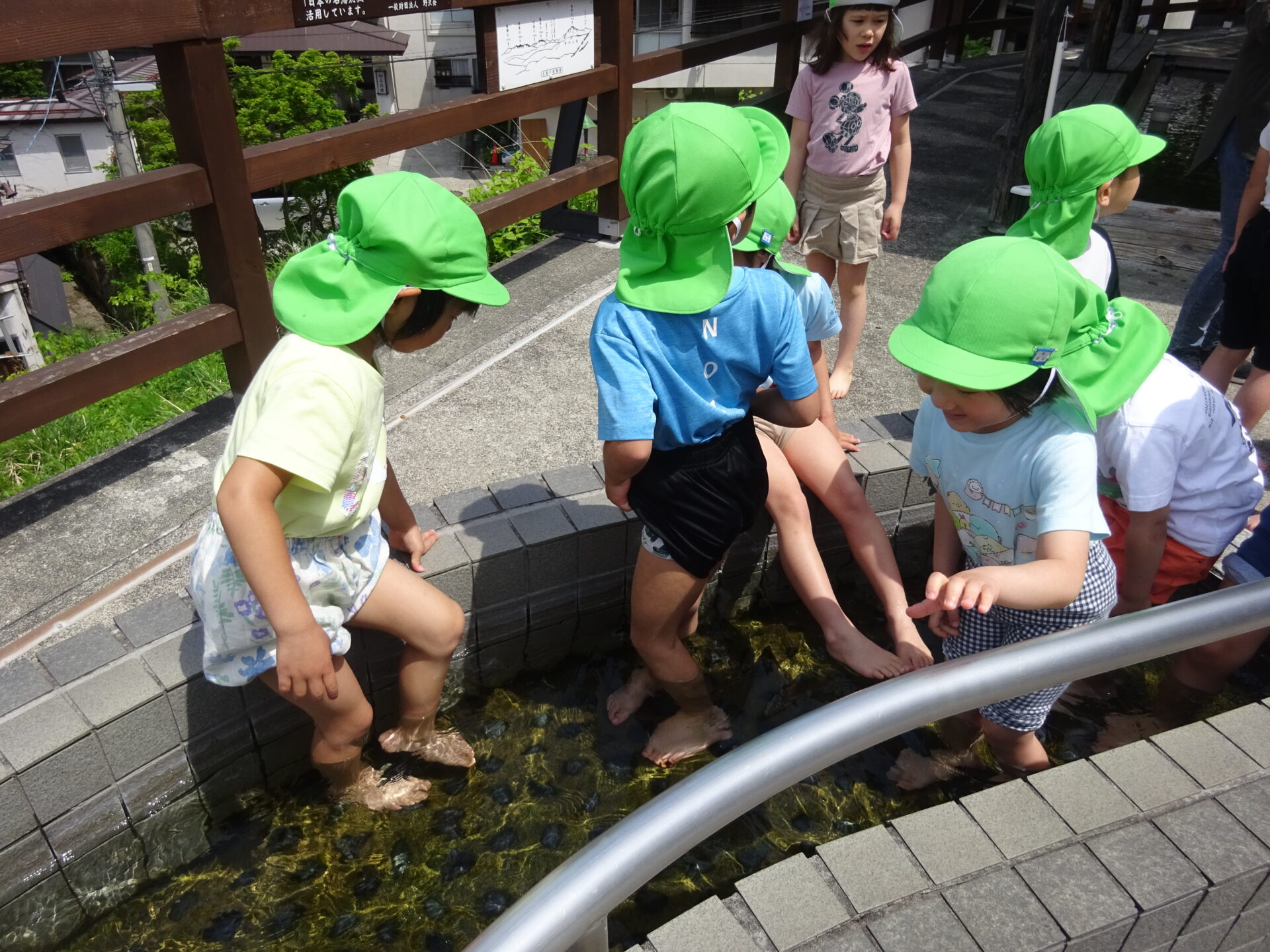〇進級してから行事や他の活動が目白押しでなかなか散歩に行けずにいましたが、この日は久し振りに出掛けることができました。今回の目的地は足湯!!登園した子から肌着・パンツ・半袖・ズボン(半ズボン)のお着替え一式を通園バッグのリュックサックに入れて準備完成。出発してすぐのお宅にある池を[鯉、いるかな?]と覗いてみましたが、かくれんぼをしていたのかな?姿が見えませんでした。残念(>_<)また、以前通った時に出ていなかった遊具が公園に設置されていることに気づくと「あっ、滑り台出ている」「ちゅうりっぷさん(未満児さん)に教えてあげなくちゃ」と言って喜んでいる姿が見られました。
