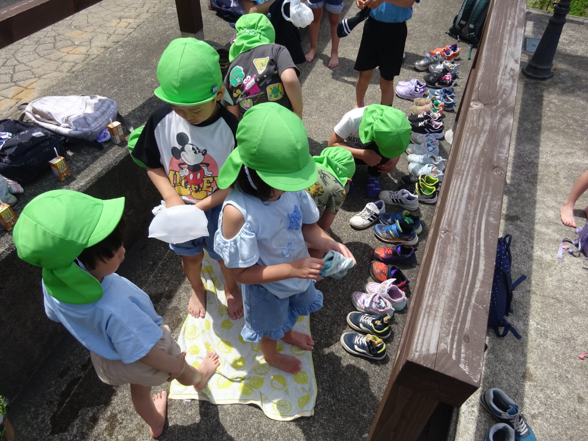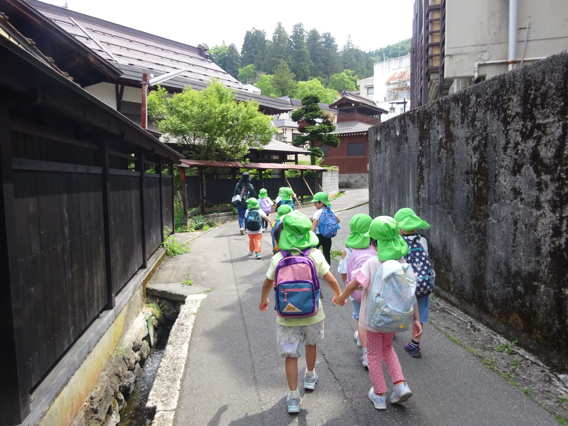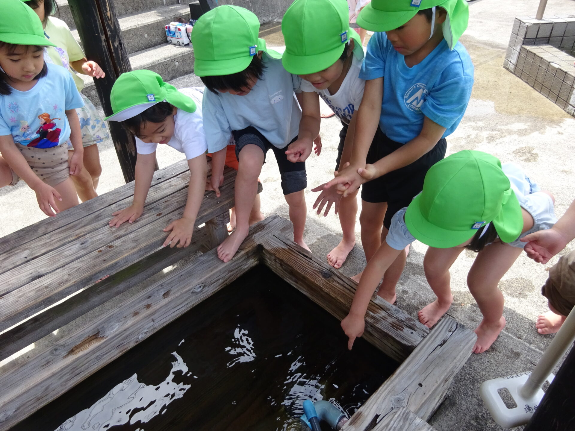 〇進級してから行事や他の活動が目白押しでなかなか散歩に行けずにいましたが、この日は久し振りに出掛けることができました。今回の目的地は足湯!!登園した子から肌着・パンツ・半袖・ズボン(半ズボン)のお着替え一式を通園バッグのリュックサックに入れて準備完成。出発してすぐのお宅にある池を[鯉、いるかな?]と覗いてみましたが、かくれんぼをしていたのかな?姿が見えませんでした。残念(>_<)また、以前通った時に出ていなかった遊具が公園に設置されていることに気づくと「あっ、滑り台出ている」「ちゅうりっぷさん(未満児さん)に教えてあげなくちゃ」と言って喜んでいる姿が見られました。