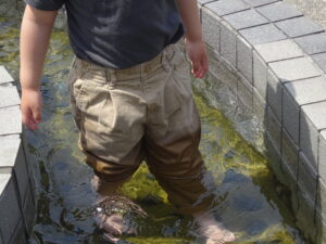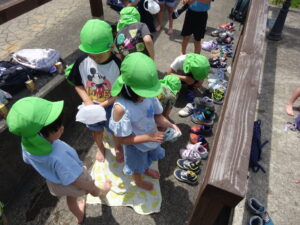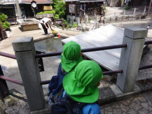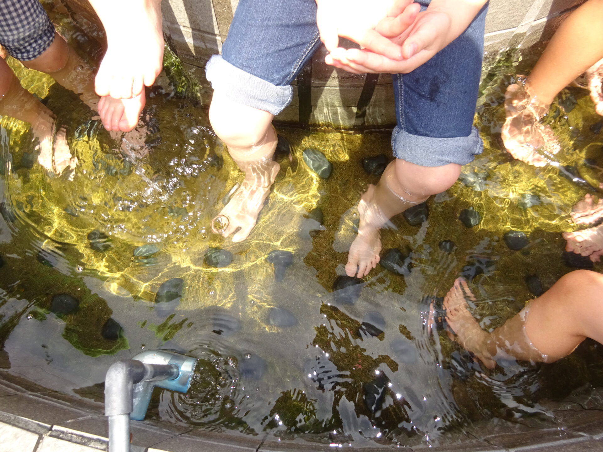 散歩でよく通る歩き慣れた路地裏を抜けて足湯に到着すると子ども達もよくわかっていて、すぐに靴と靴下を脱ぎ始め支度を進めていました。着ている上着が濡れないようにズボンの中に入れ、さらに裾を捲り上げられるだけの位置まで捲って、まずは持って行った麦茶で水分補給をしました。