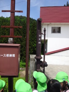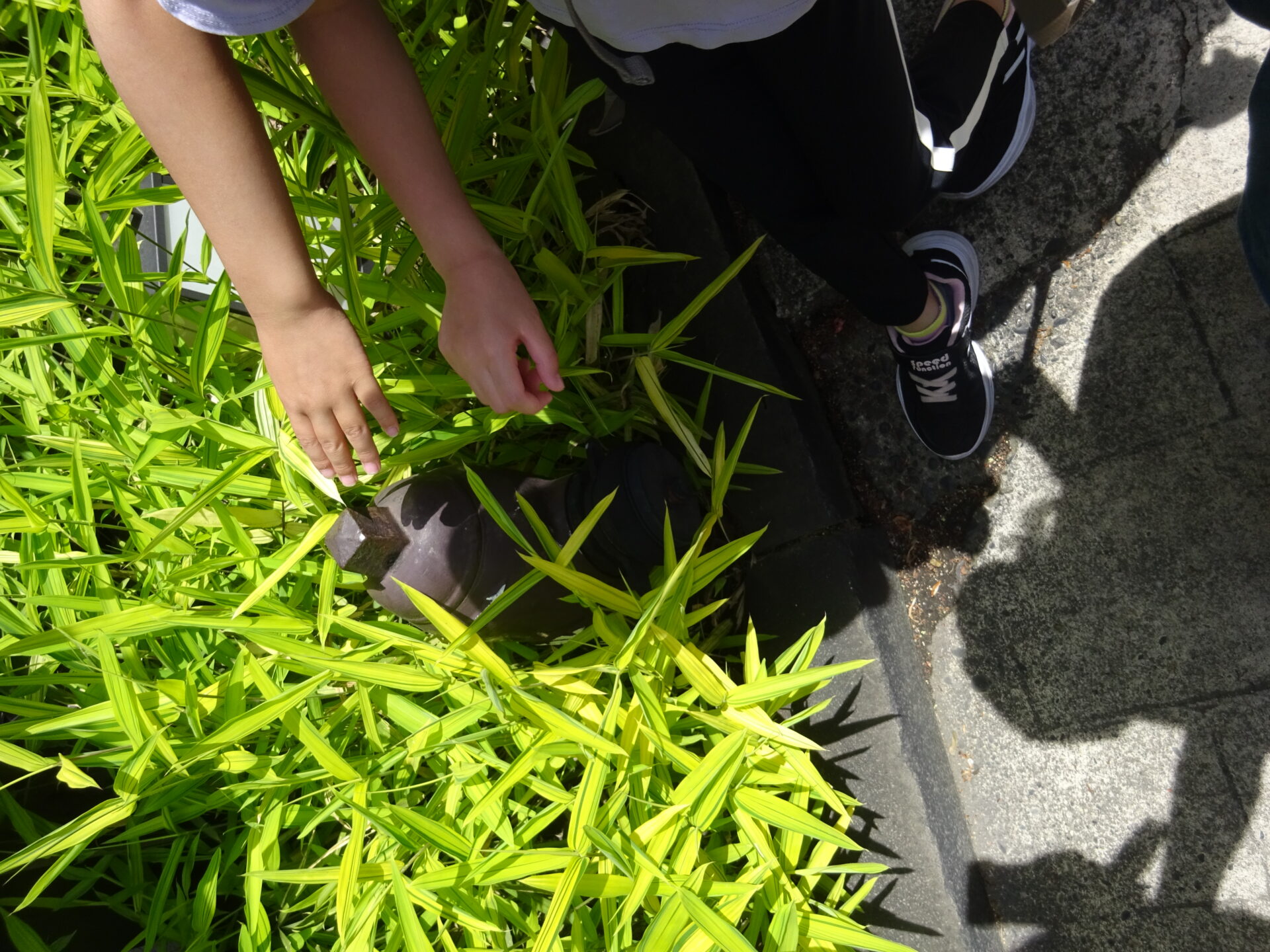 今年度、活動の一つにしている消火栓探しも決行!草の中にひっそり隠れるようにして設置されているもの、自分達よりはるかに高いもの、直角に曲がっているものなどを見つけることができ、「うわぁ、こんなところにある」「高っ(高い)」「何だ、これ。面白い」と見つけるたびに大興奮でした。