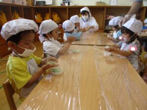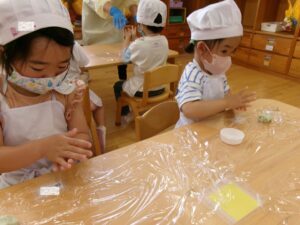 給食の先生がペーストしてくれたよもぎを白生地と混ぜ合わせたもので自分のよもぎ団子を作り、おやつの時間においしく頂きました。