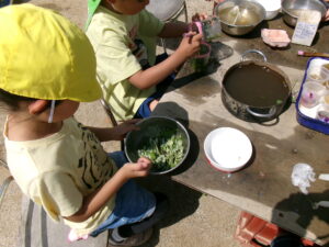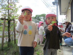 自分で探し、摘んで集めた”よもぎ”を調理をして食べるという体験を通して、”よもぎ”が食べられる植物であることを知り、身近な植物へ関心をもってほしい…それと同時に身近な春の自然に触れ『五感』で感じ、自然への興味につながってほしいと願い、ここ数年、春になると子どもたちと楽しく取り組んでいます。