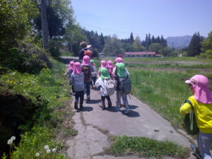 春探しで散歩に出かけた際に、農道でカエルを見つけた子どもたち。