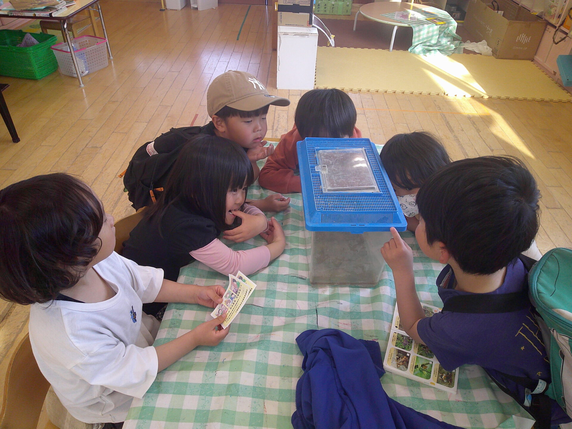 虫かごの中にいるカエルをみんなで観察すると