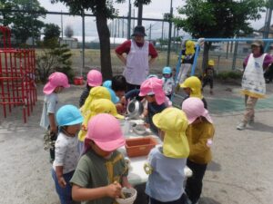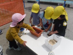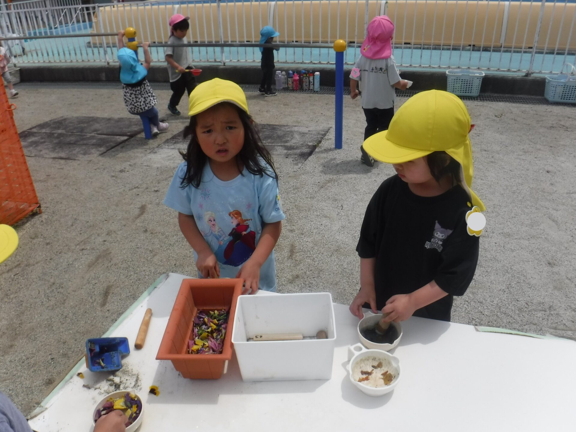 咲き終わったお花で色水遊びを楽しんでいる年中さん。