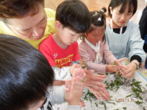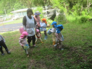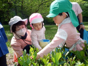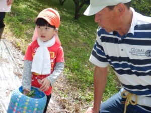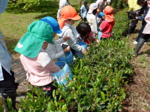 いつもは「一芯三葉(いっしんさんよう)」といって上から3枚の葉っぱを摘みますが、今回は葉っぱが硬そうでしたので「一芯二葉」で摘むことになり、やってみました。30分ほど摘むと、だんだん暑くなってきたので「このくらいにしよう」と、保育園へ戻りました。