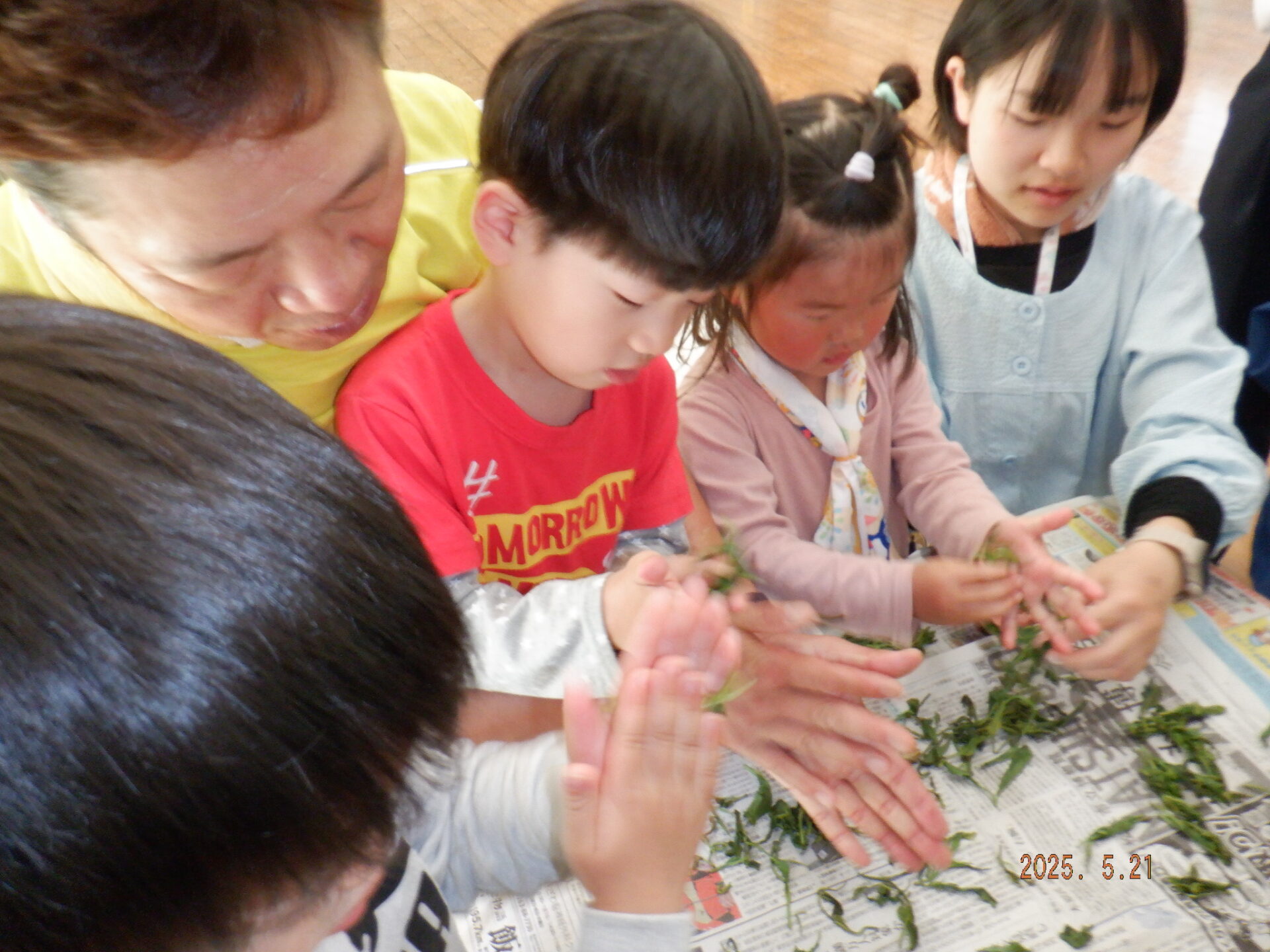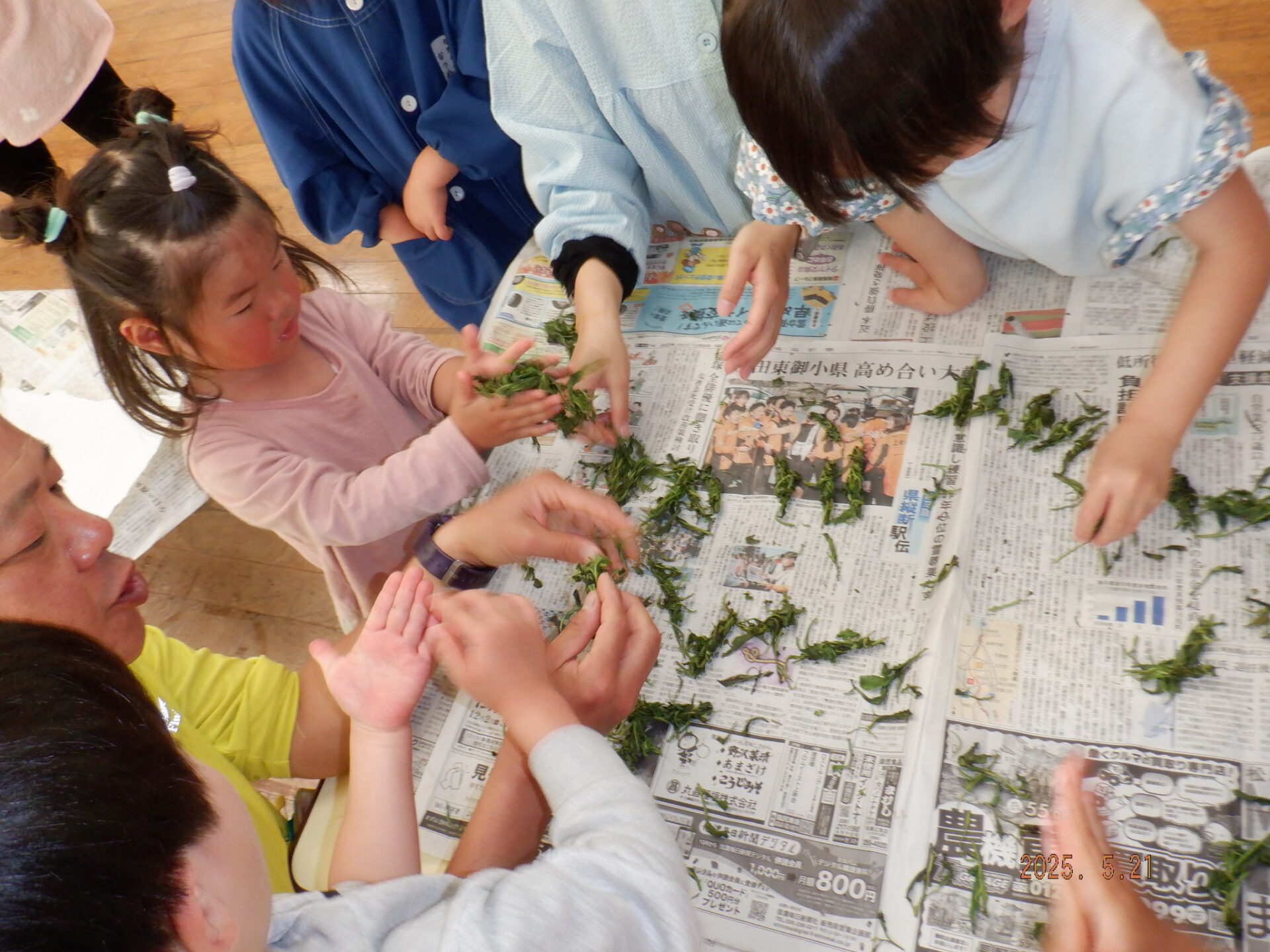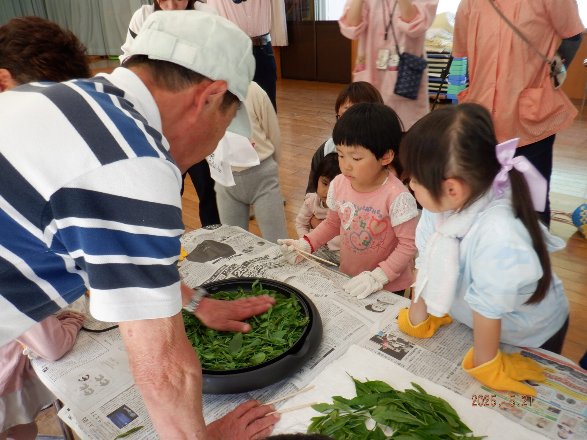 今年は、保育園のそばに住んでいて茶師でもある、「岡井さん」が来てくださり、一緒お茶摘みをして「釜炒り手もみ茶」作りに挑戦しました。