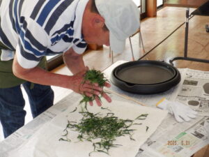岡井名人は子どもたちとは別に「蒸したお茶の葉」を「のりうち」した和紙の上でもんでいました。
