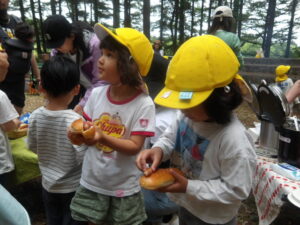 「煙で目が痛い!」と話す子もいましたが、自分で作ったカートンドッグが焼けるのを見守っていました。