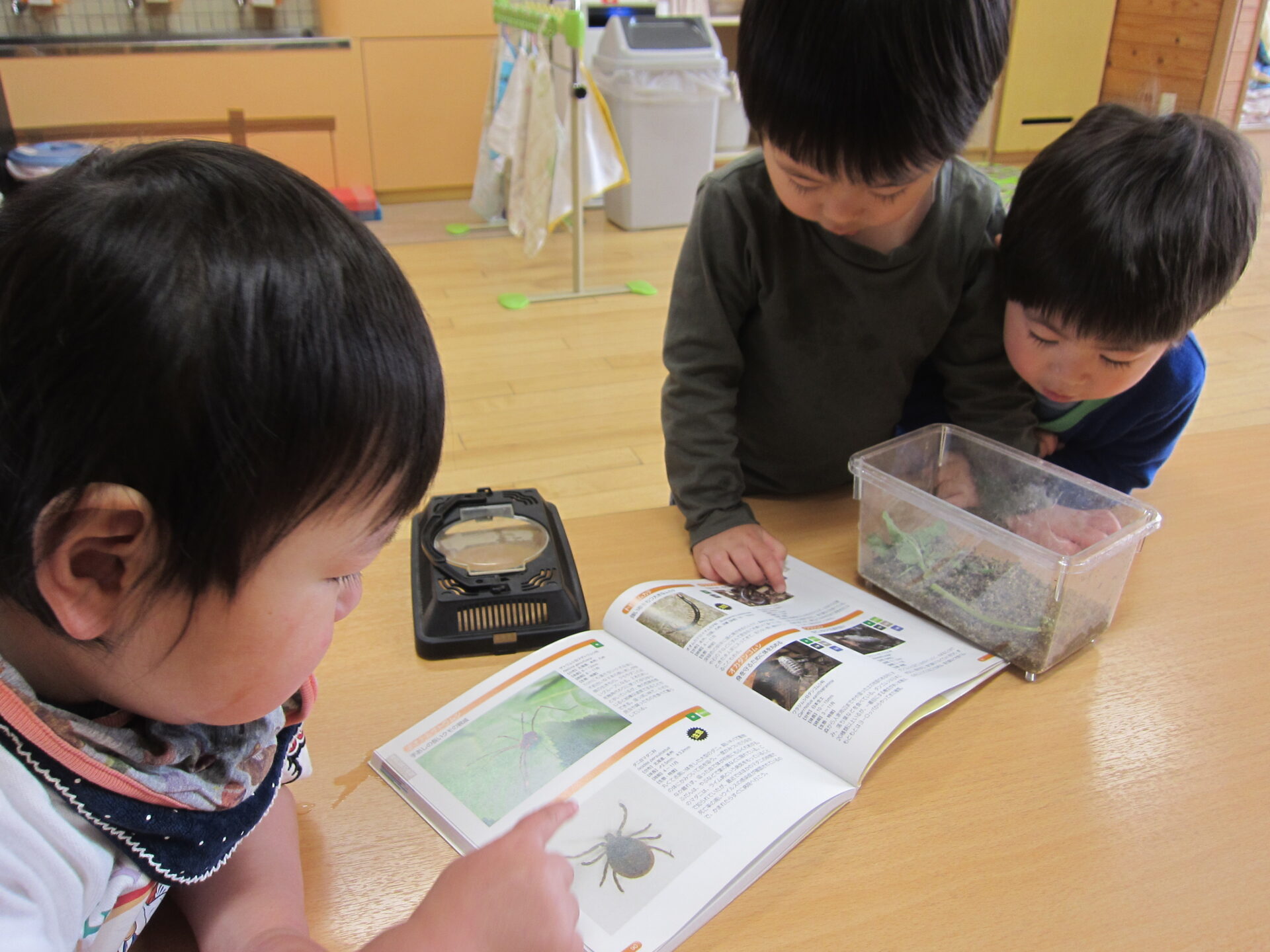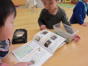 部屋の中では、図鑑を見ながら「これじゃない?」「これだんごむし?」と子ども同士で会話をしていました。