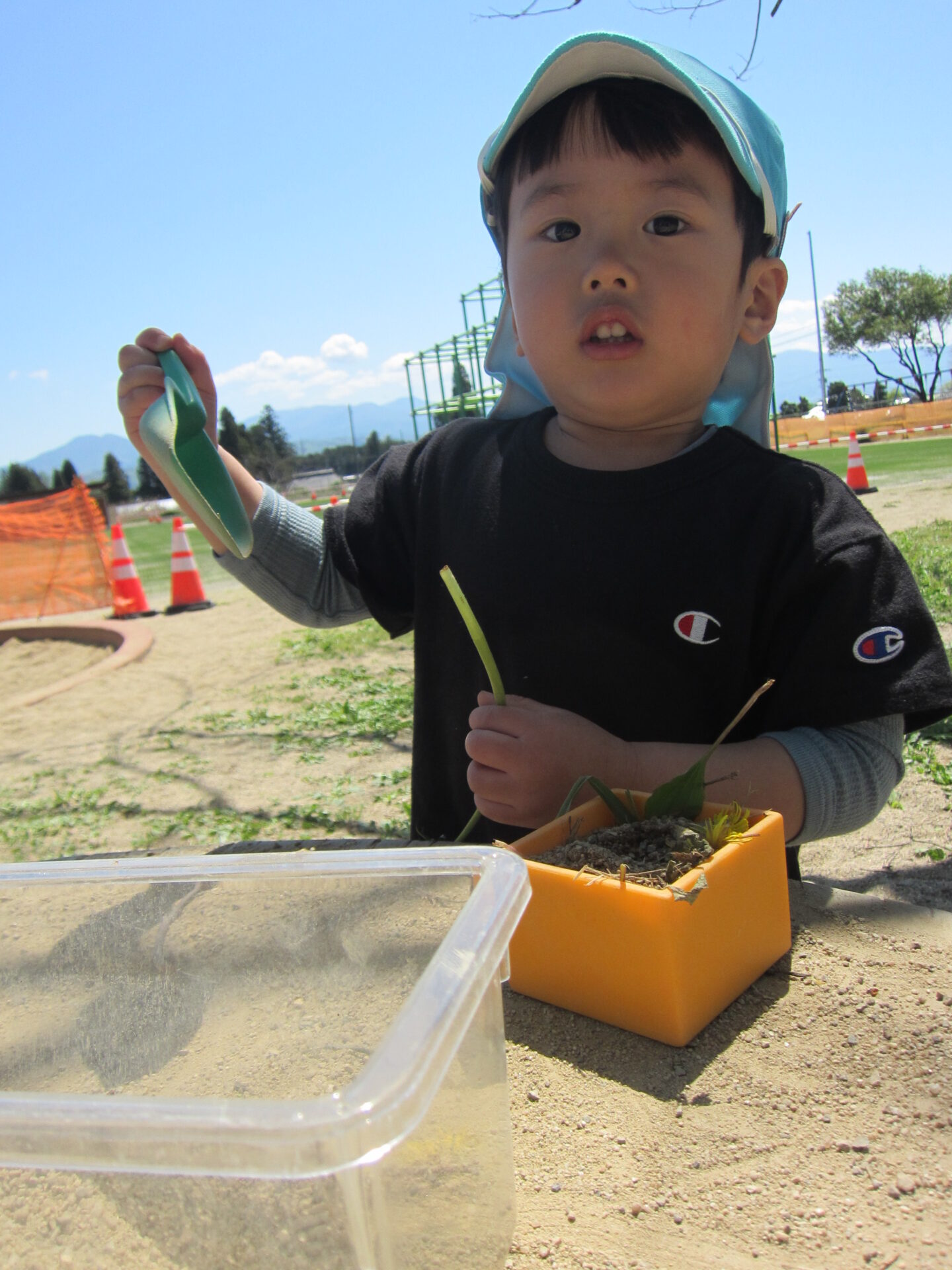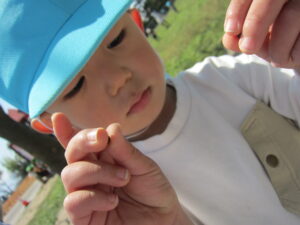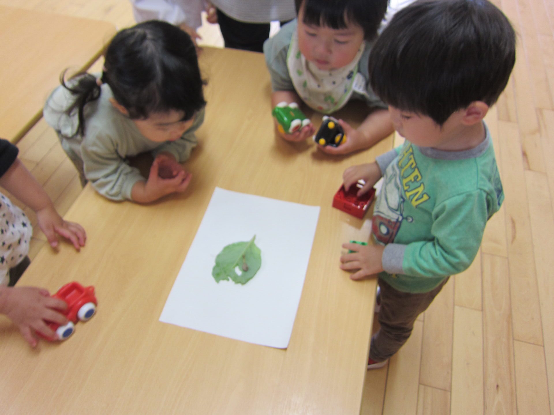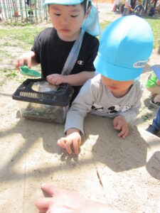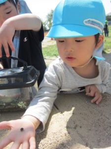 色々なことに興味がある2歳児の子ども達。虫の扱い方にはまだまだ未熟さもありますが、保育士が一緒に関わりながら、虫とのふれあいを大切にしていきたいと思います。