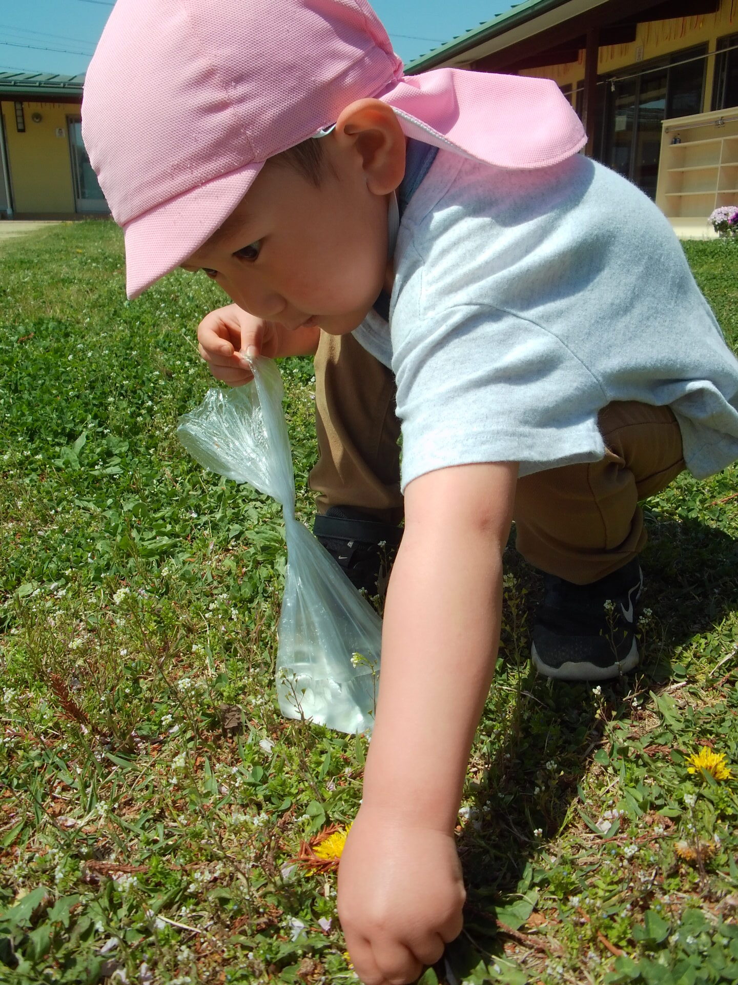 園庭にクローバーやたんぽぽ、パンジーがたくさん咲いて、子どもたちも興味をもって摘んでいます