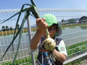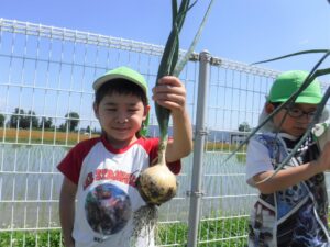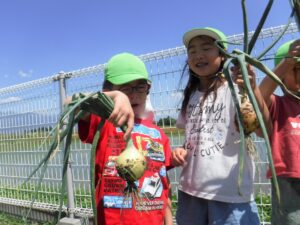 玉ねぎの収穫体験は初めての子が多く、どうやって抜くの?? と戸惑う姿もありましたが、抜けると「うわっすご〜い」と感動の声! 身近な野菜ではありますが、どんな風に穫れるのかはあまり知られていないので、新鮮な経験になったようです。玉ねぎの産地豊科で育つ子どもたちに、より身近に感じることができたのではないでしょうか。