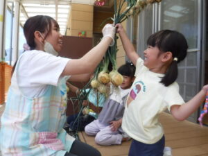 ・年中さんの時に植えた玉ねぎが立派に大きくなり、収穫できました。