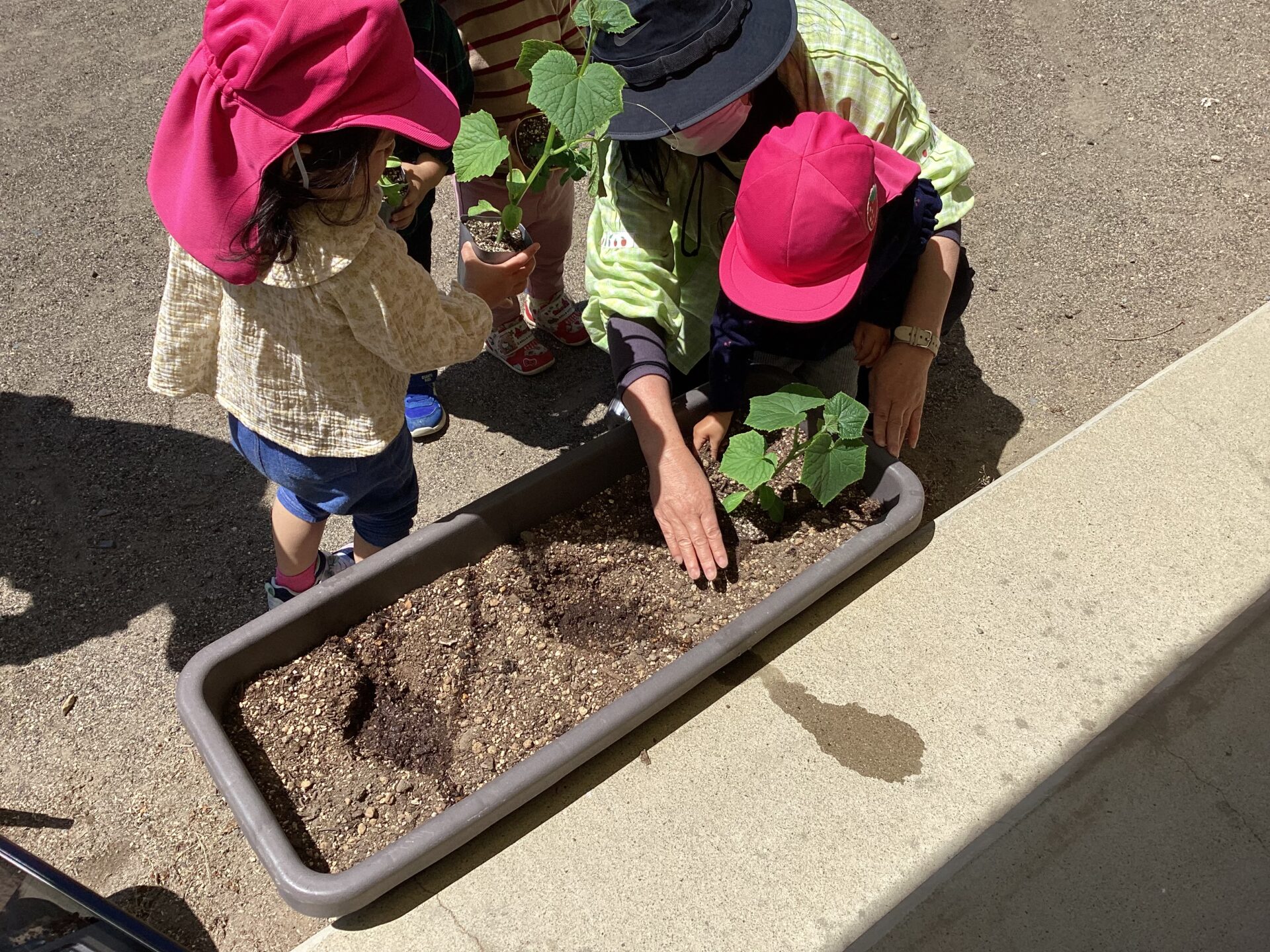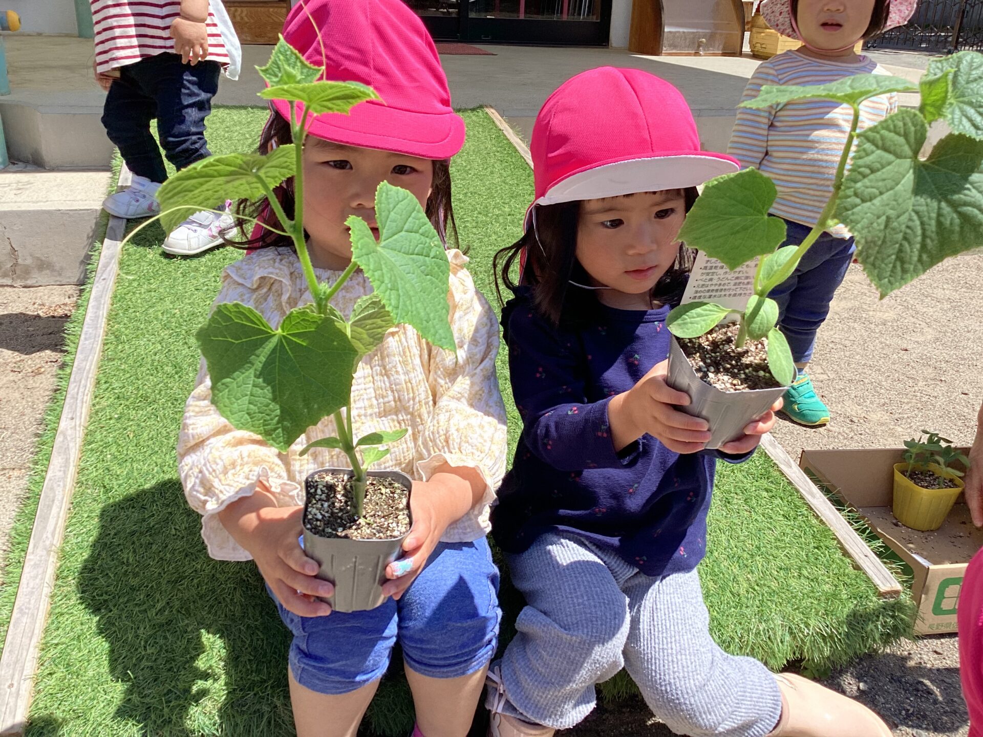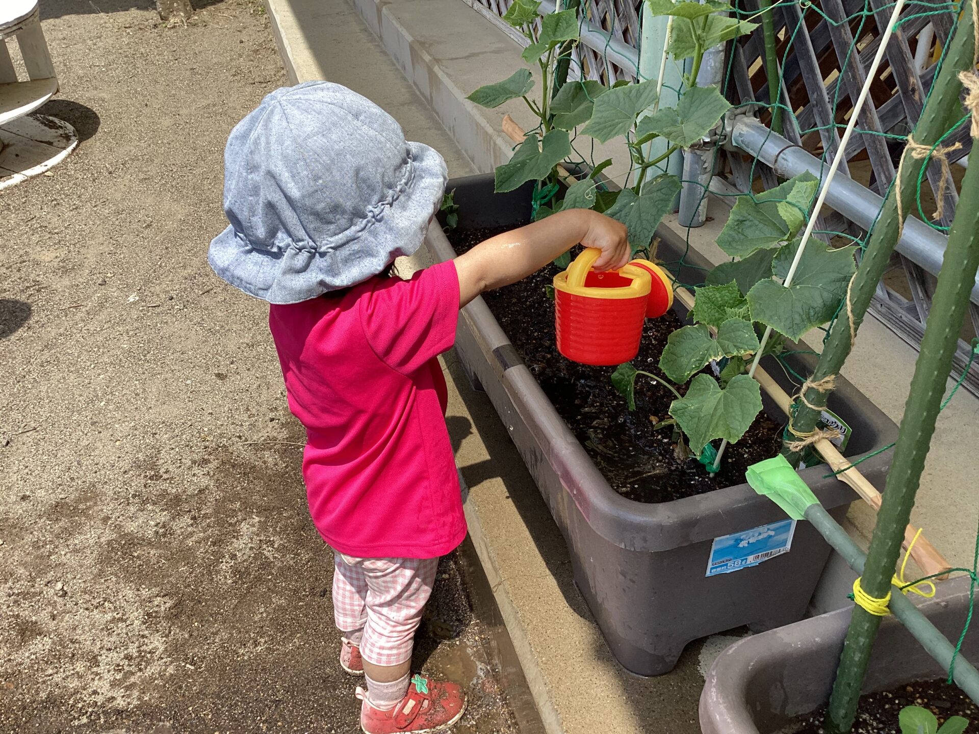 ・水をあげたり、野菜の様子をみたりなどする機会を通して、生長を楽しみにするとともに、少しずつ変化していく野菜の様子に気づいてほしい。