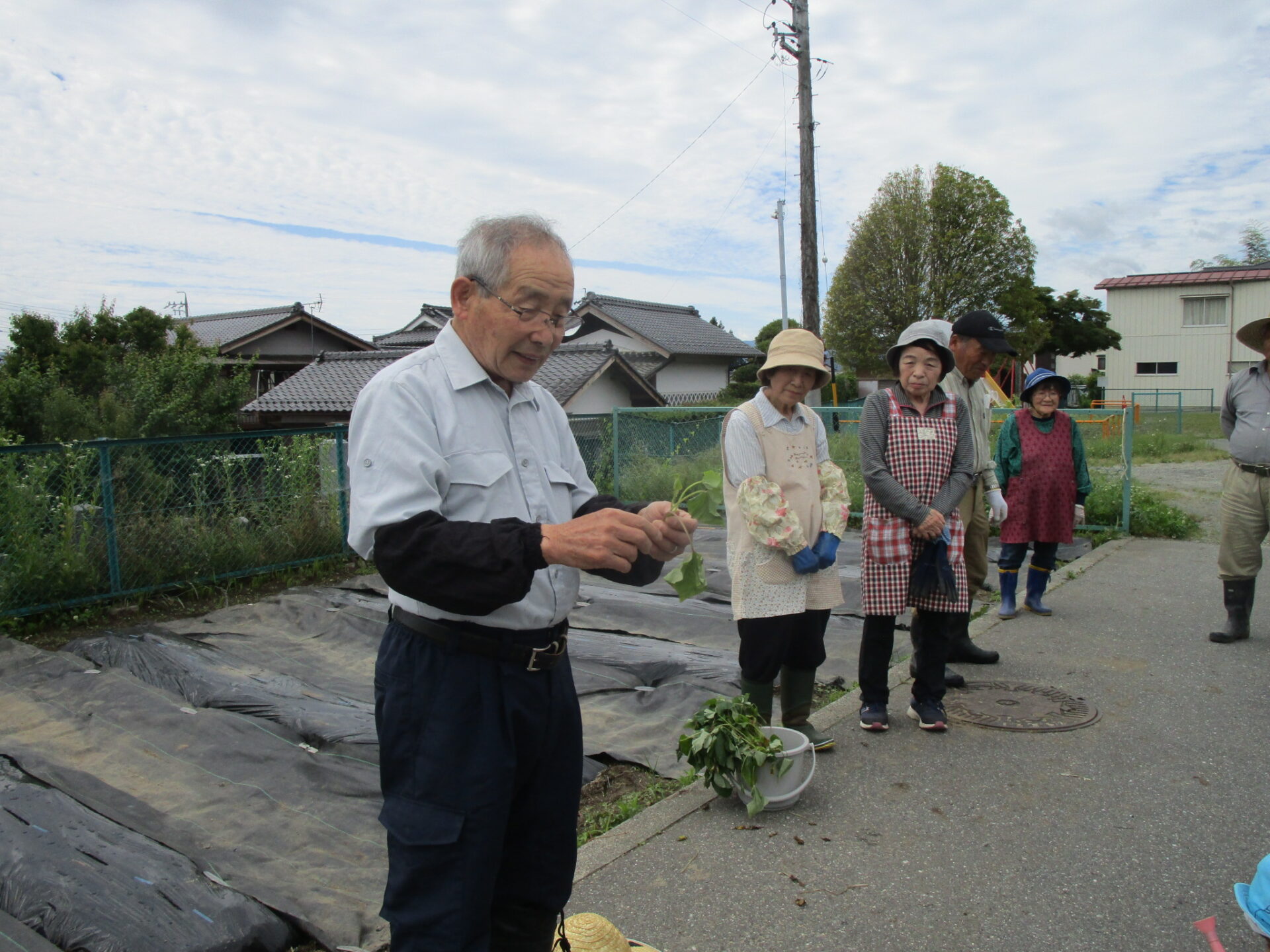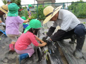 地域の高齢者クラブの方がさつま芋の苗を植える子どもたちのために集まってくれました。朝から防草シートを敷いたり、マルチに穴をあけたりして準備を手伝ってくれました。