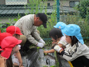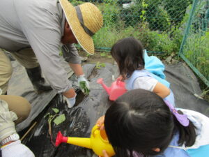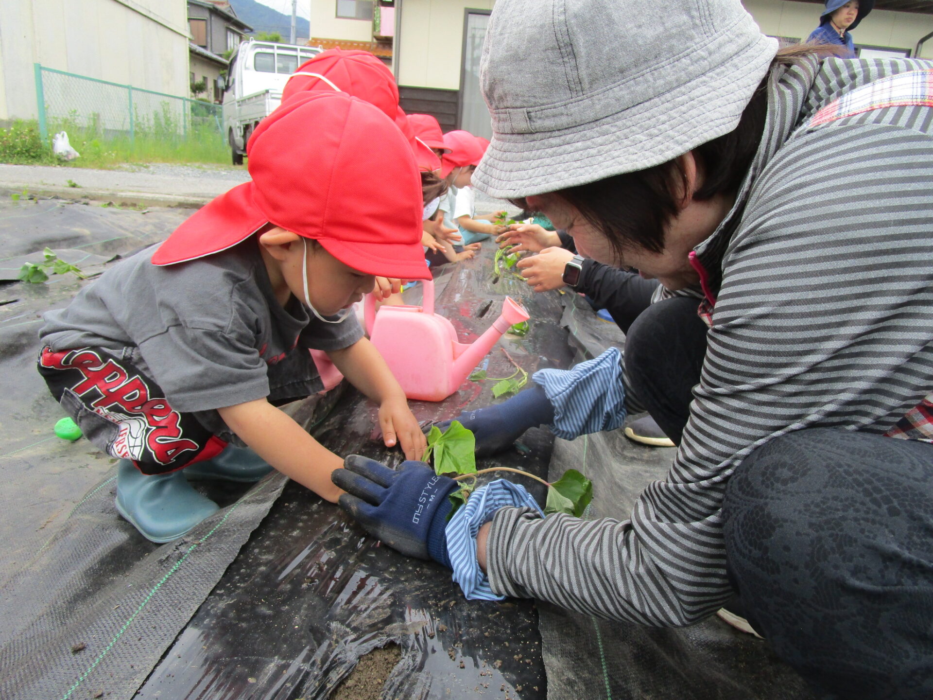 年中さんも去年の経験はあるけれど、年に一回のことなので、おじいさん、おばあさんが丁寧に関わってくれて安心して植えられました。