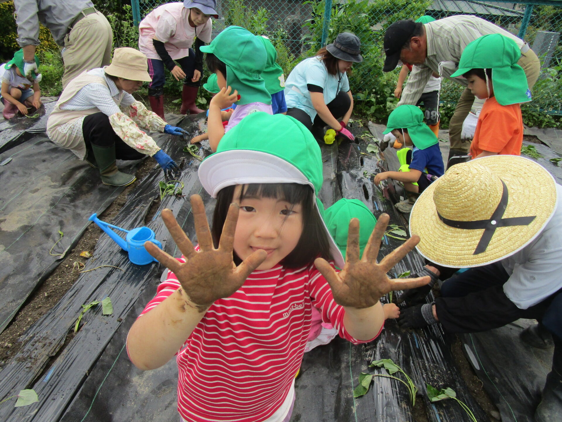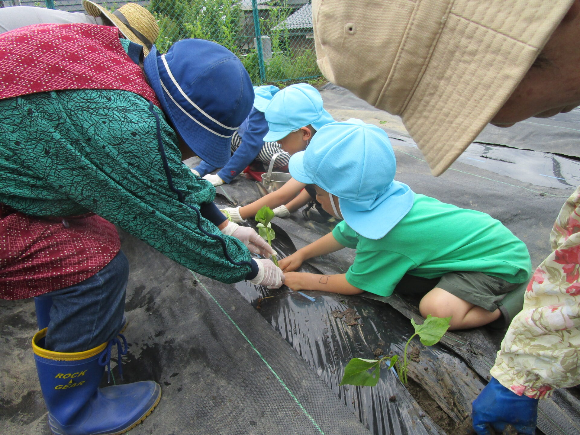 ・高齢者クラブの方に手伝っていただき、子どもたちはさつま芋の苗植えが出来ました。高齢者クラブの方がやさしく手を貸してくれて安心して植えられた子どもたち、年に数回の関わりではもったいないと感じました。地域の方に見守ってもらい、かわいいと言ってもらい、お互いにとってこの交流が心地よいものになりそうです。大事にしていきたいと思います。