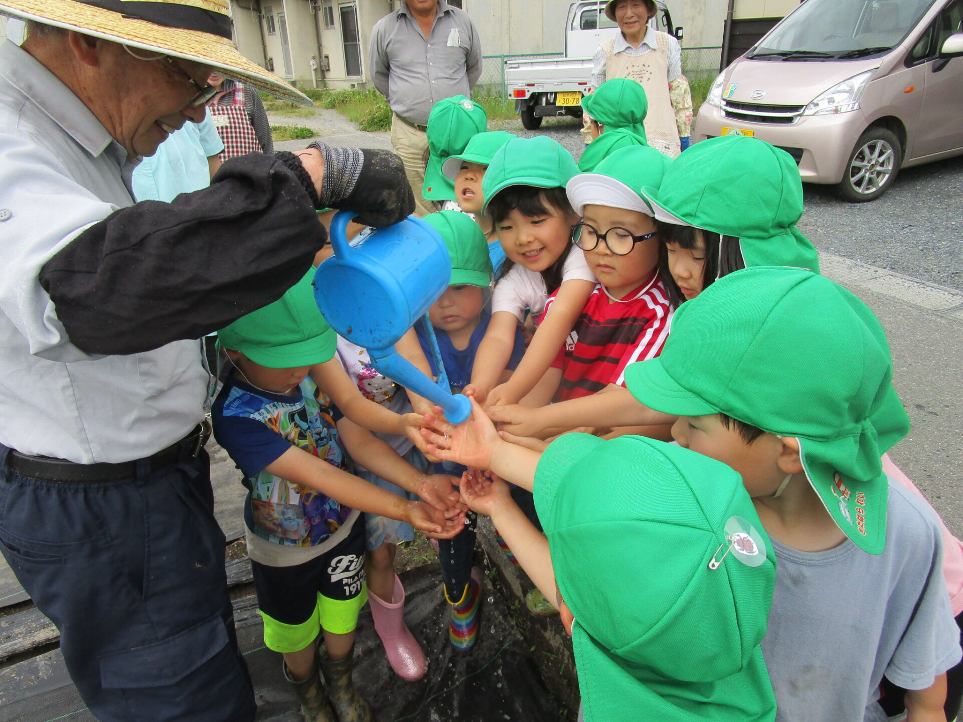 おじいさんがじょろの水をかけてくれて手の泥んこ汚れを洗い流しました。次々に子どもたちが集まってきます。