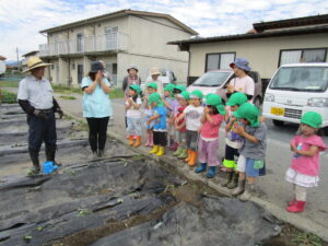 最初に年長さんがさつま芋の苗の植え方を教えてもらいました。