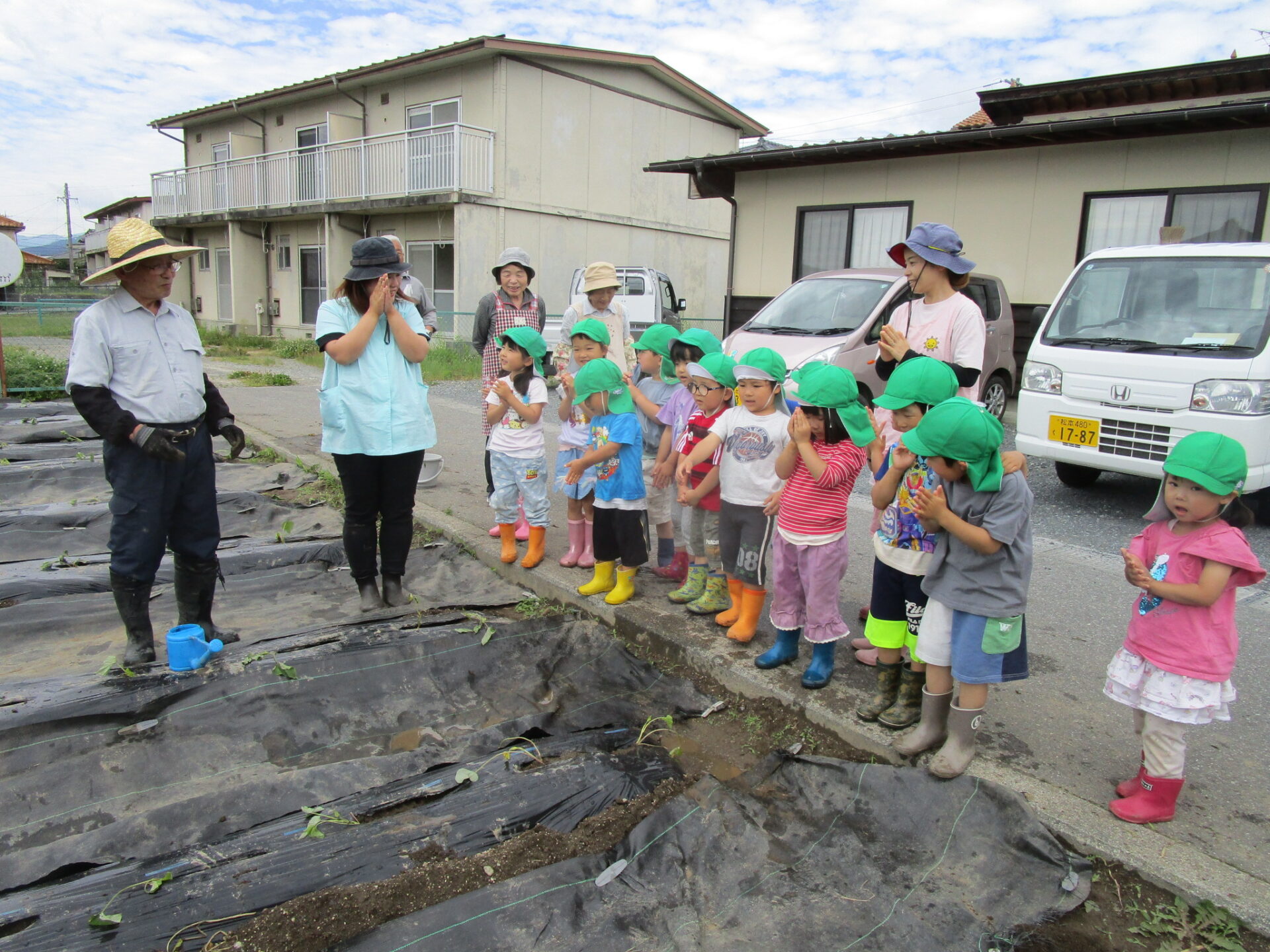 最後に年中さんが代表で畑に植え終えた苗に向かって「おおきくな~れ」「たくさんのお芋ができますように!」とパワーを送りました。
