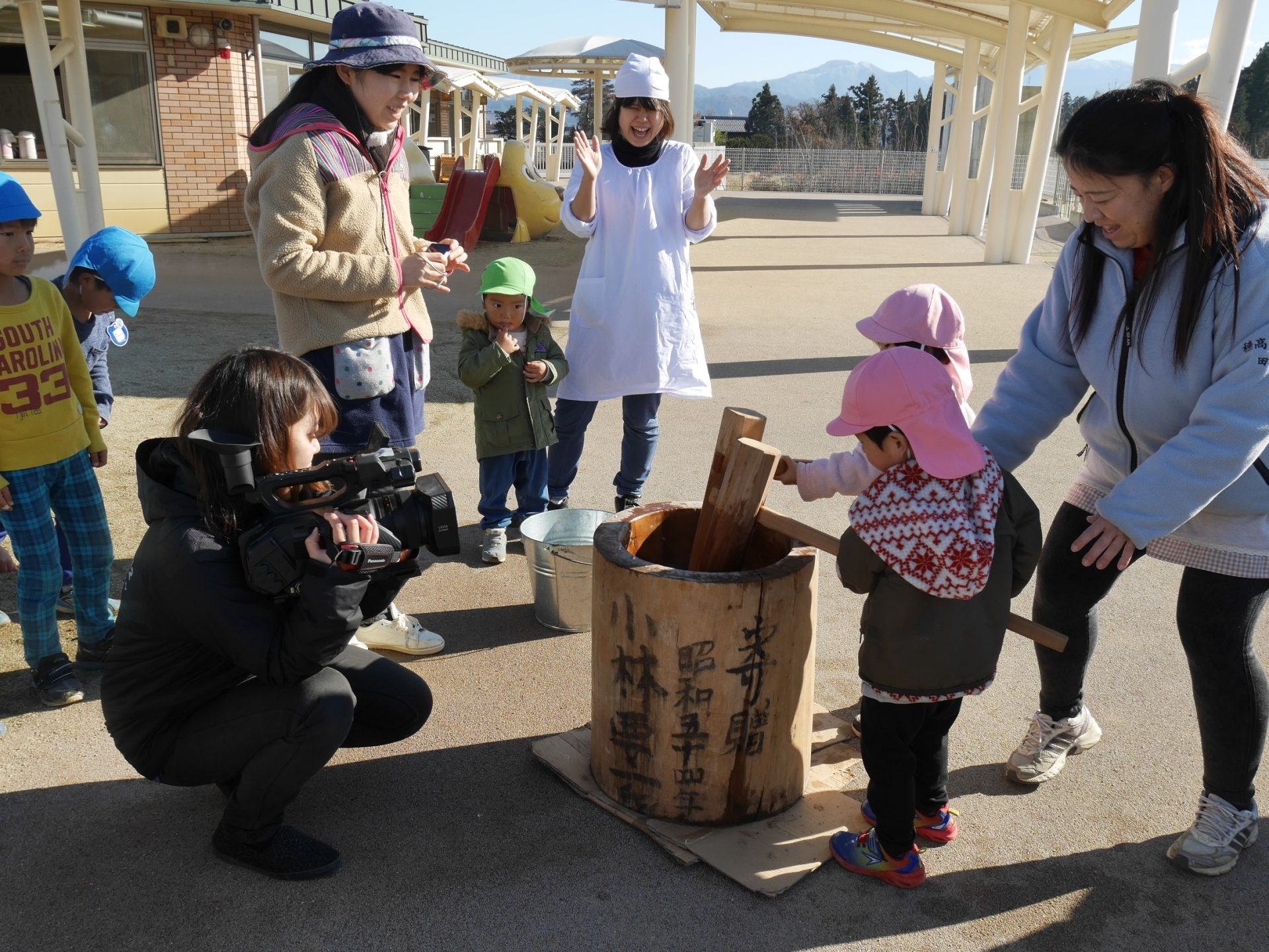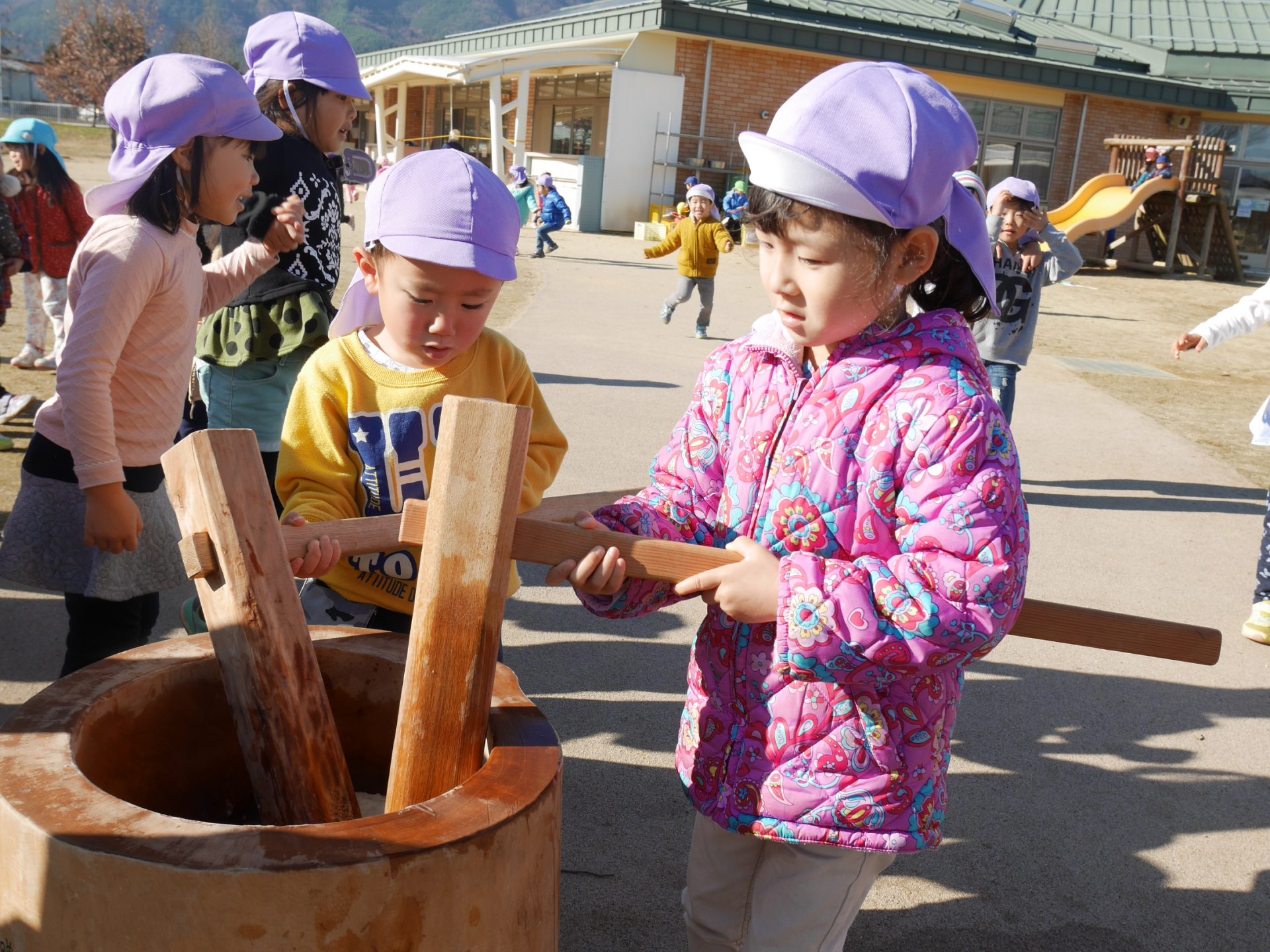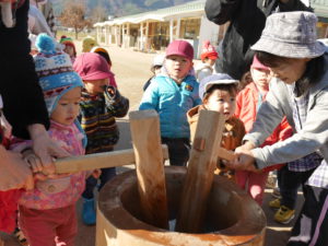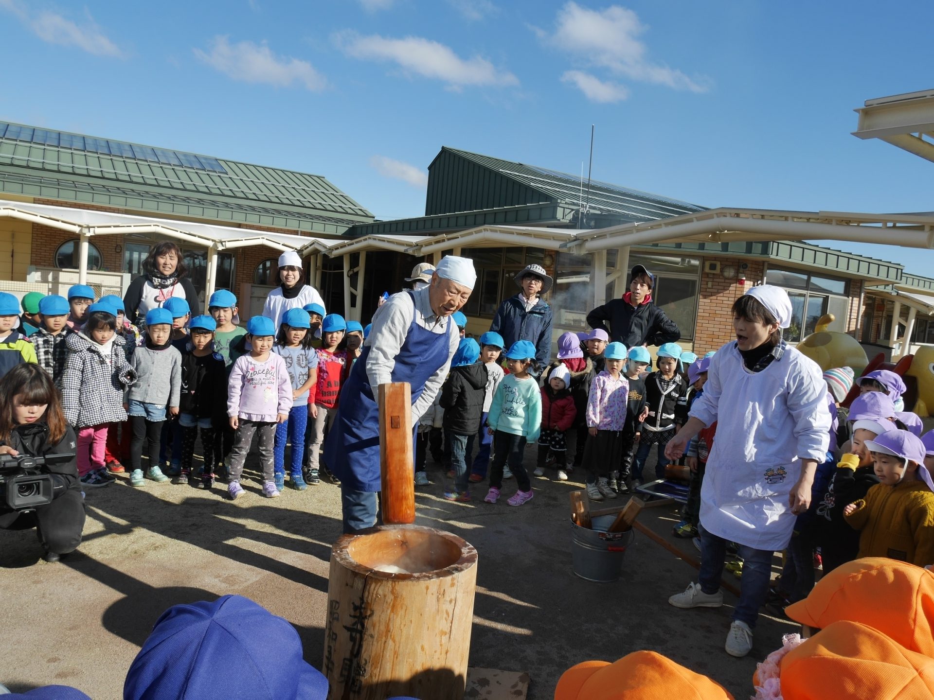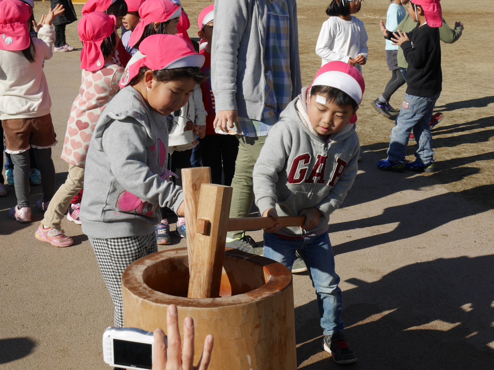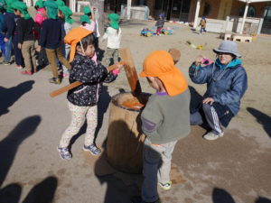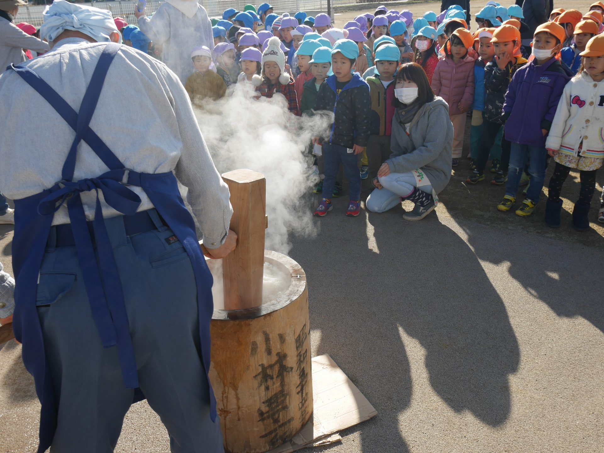 天気に恵まれた12月。以上児は前日にもち米を洗って準備ばんたん。朝園庭でカマドにセイロをのせてお米を蒸し、時間が経つといい匂いがしてきました。