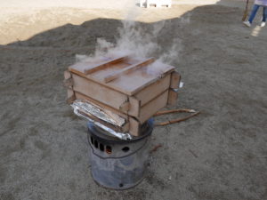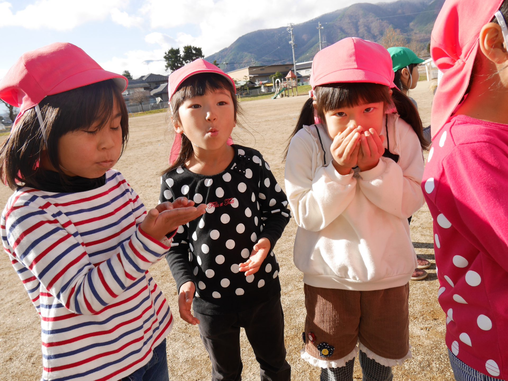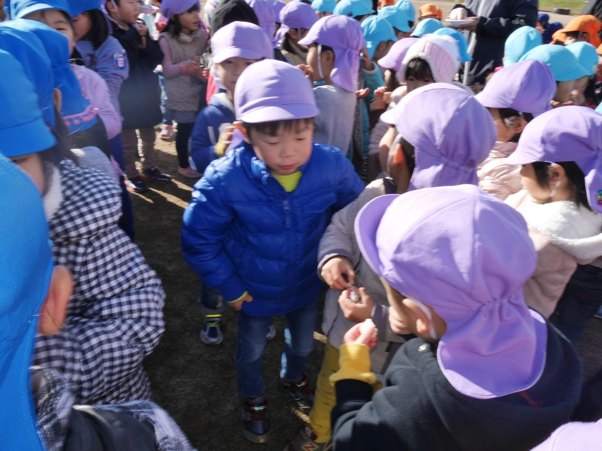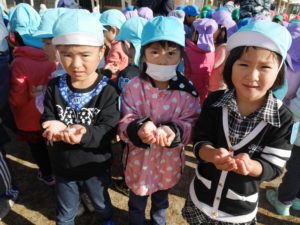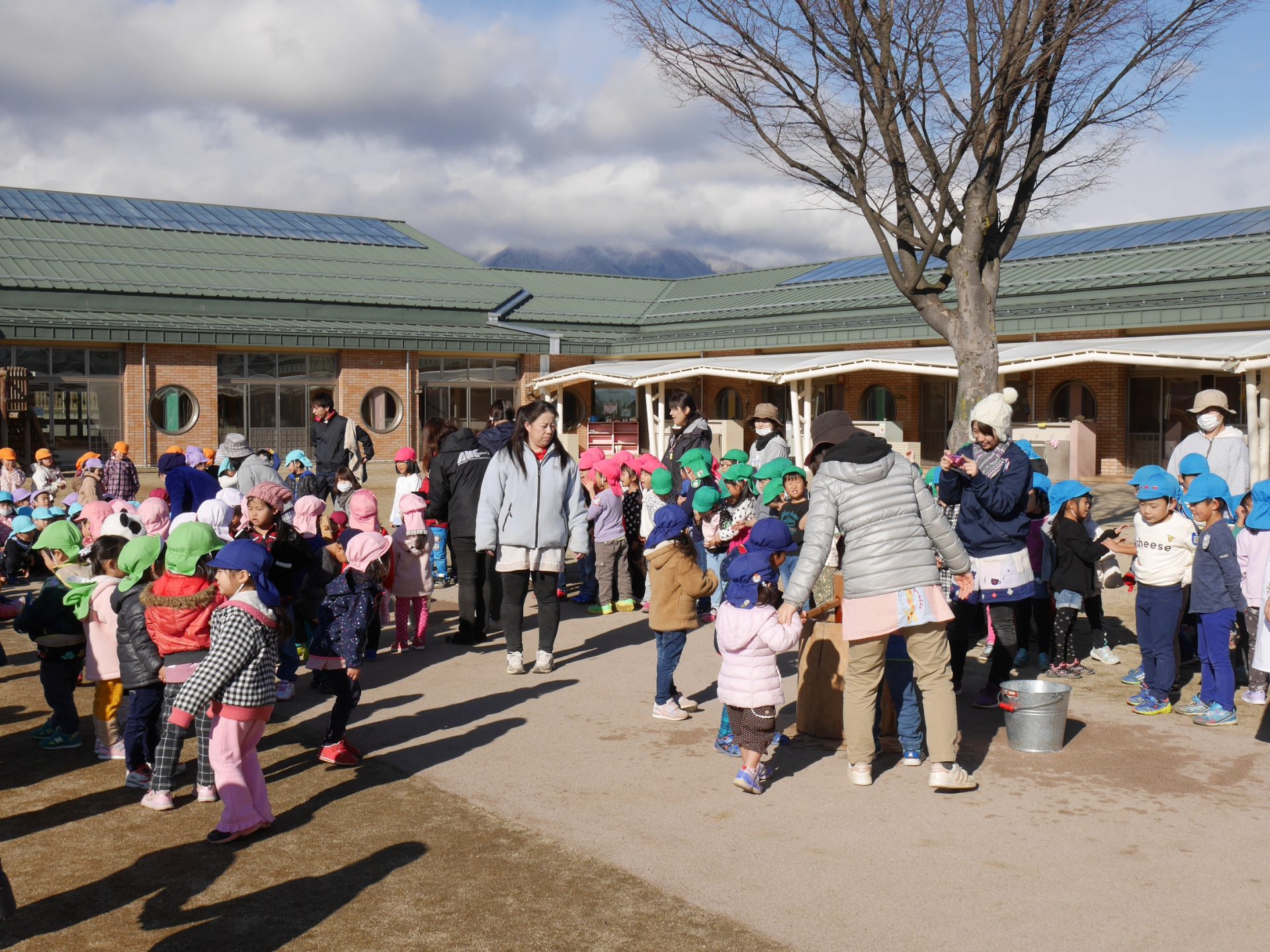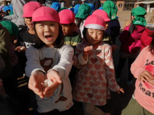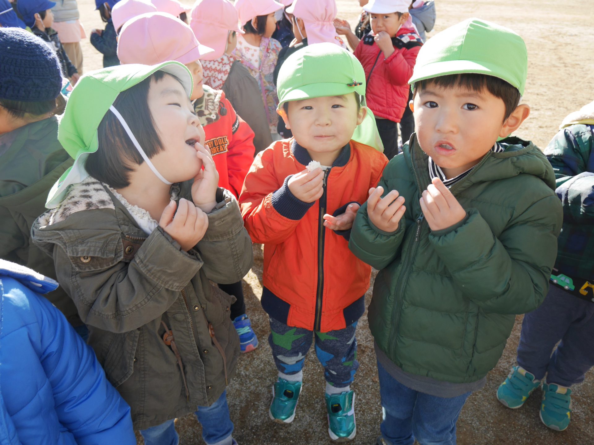 天気に恵まれた12月。以上児は前日にもち米を洗って準備ばんたん。朝園庭でカマドにセイロをのせてお米を蒸し、時間が経つといい匂いがしてきました。