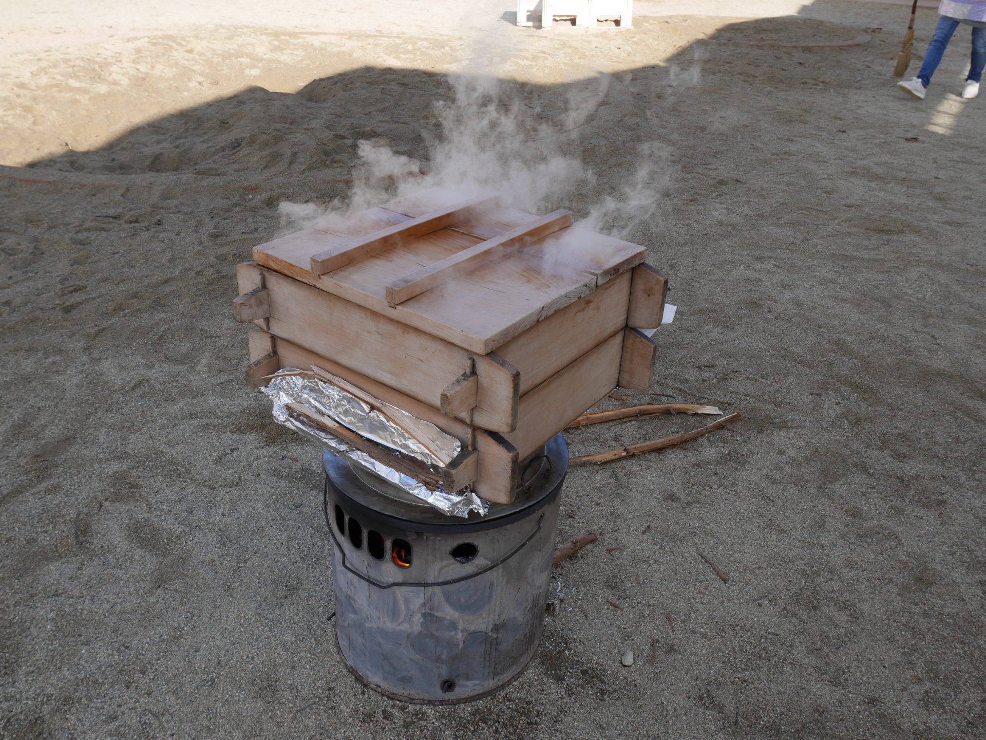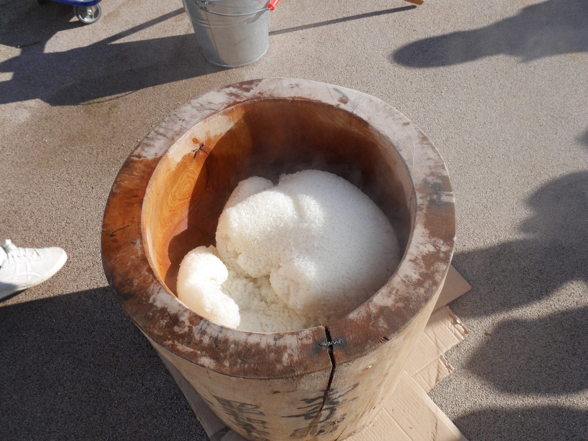 「ほら!おいしそう」みんなで蒸かしたおこわをいただきます。