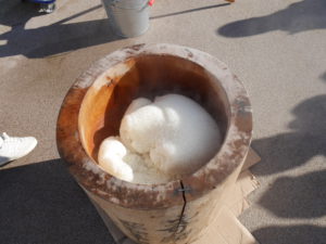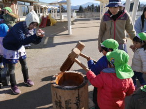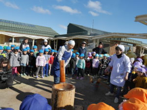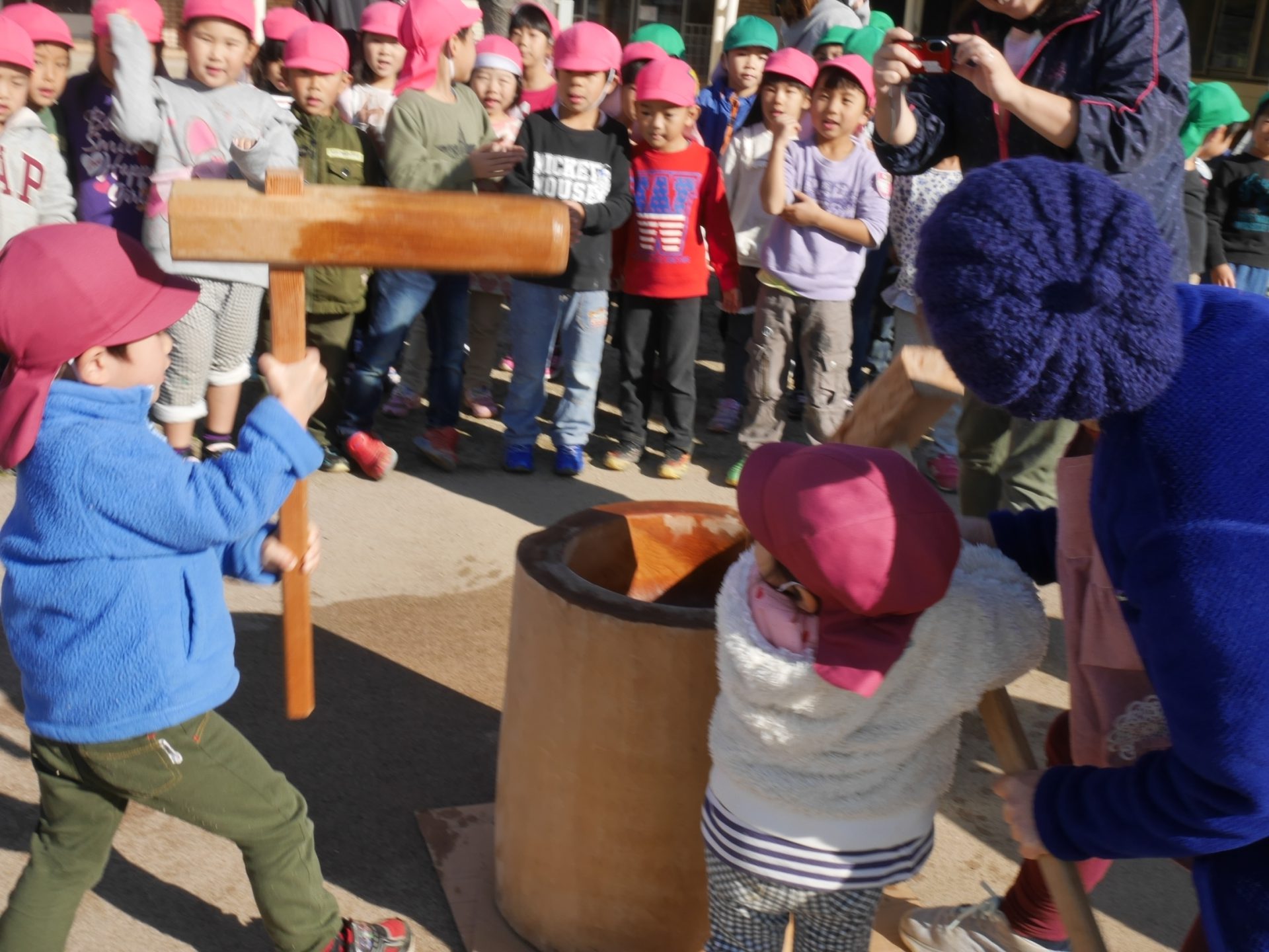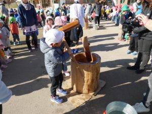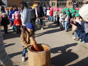 さあ次はいよいよお餅つきの始まりです。まずはおじいちゃん先生が力強く大きな杵でつき始めました。